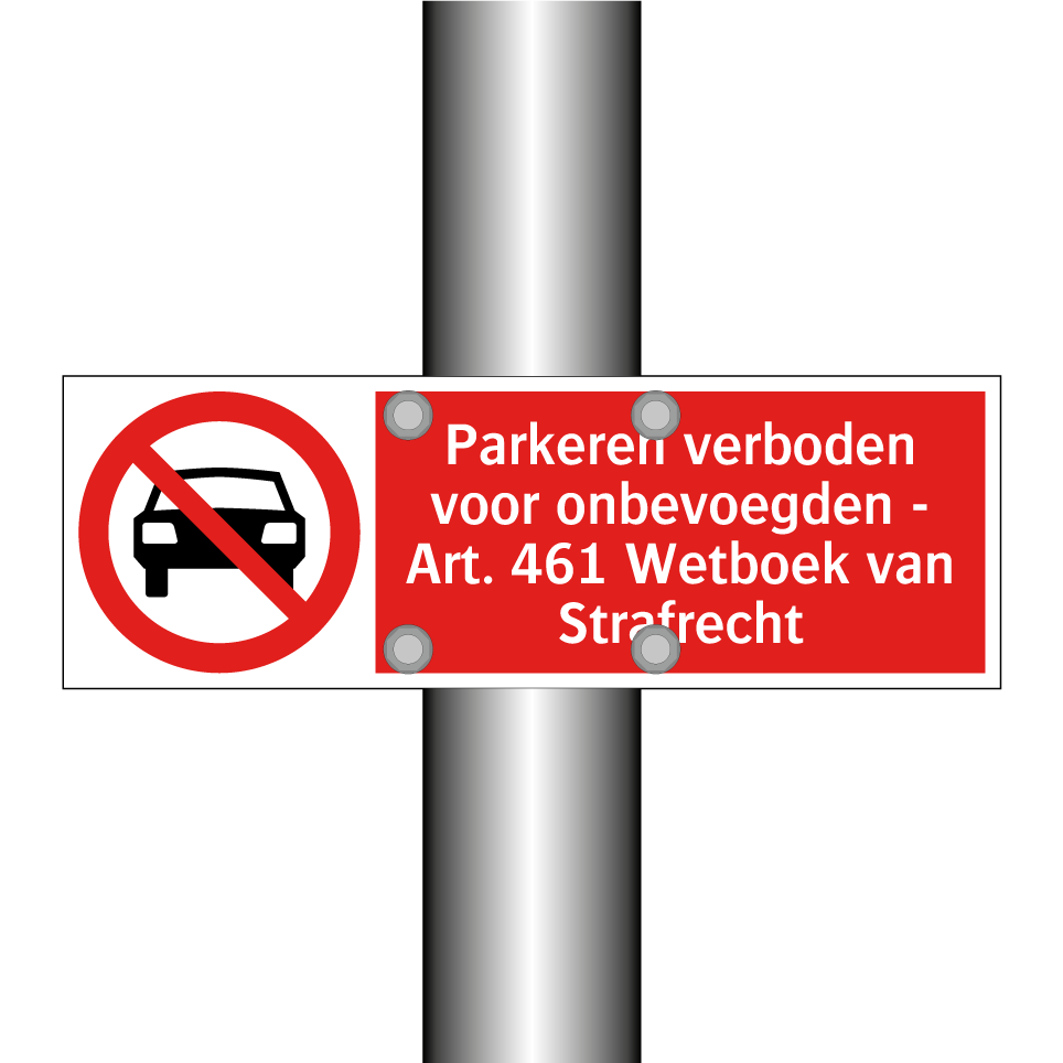 Verbodsbord met de tekst Parkeren verboden voor onbevoegden - Art. 461 Wetboek van Strafrecht