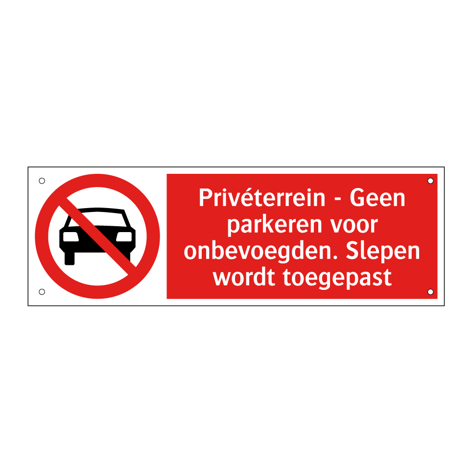 Verbodsbord met de tekst Privéterrein - Geen parkeren voor onbevoegden. Slepen wordt toegepast