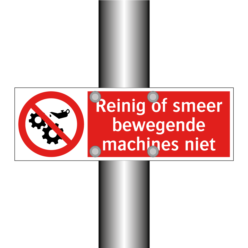 Verbodsbord met de tekst Reinig of smeer bewegende machines niet