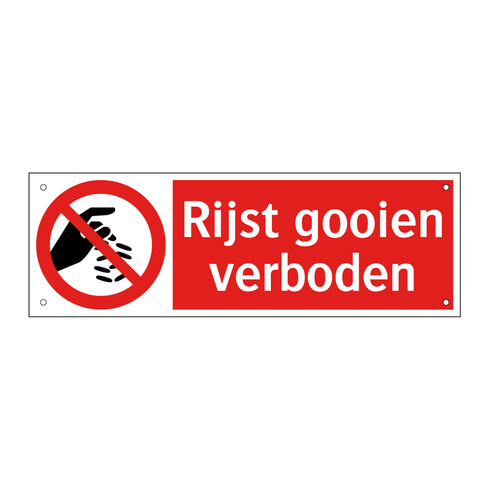 Deze opvallende verbodsbord is ideaal voor evenementen en locaties waar het ongewenst is om rijst te gooien. Met zijn heldere rode achtergrond en duidelijke witte tekst trekt het onmiddellijk de aandacht en communiceert het een duidelijke boodschap. Dit bord kan strategisch worden geplaatst bij de ingang van trouwlocaties, feestzalen of andere openbare ruimtes om bezoekers te informeren en ongewenst gedrag te voorkomen. Het gebruik van een universeel symbool versterkt de boodschap en zorgt ervoor dat iedereen, ongeacht taalvaardigheid, de instructie begrijpt. Dit verbodsbord is een essentiële toevoeging voor elke locatie die een nette en veilige omgeving wil behouden.