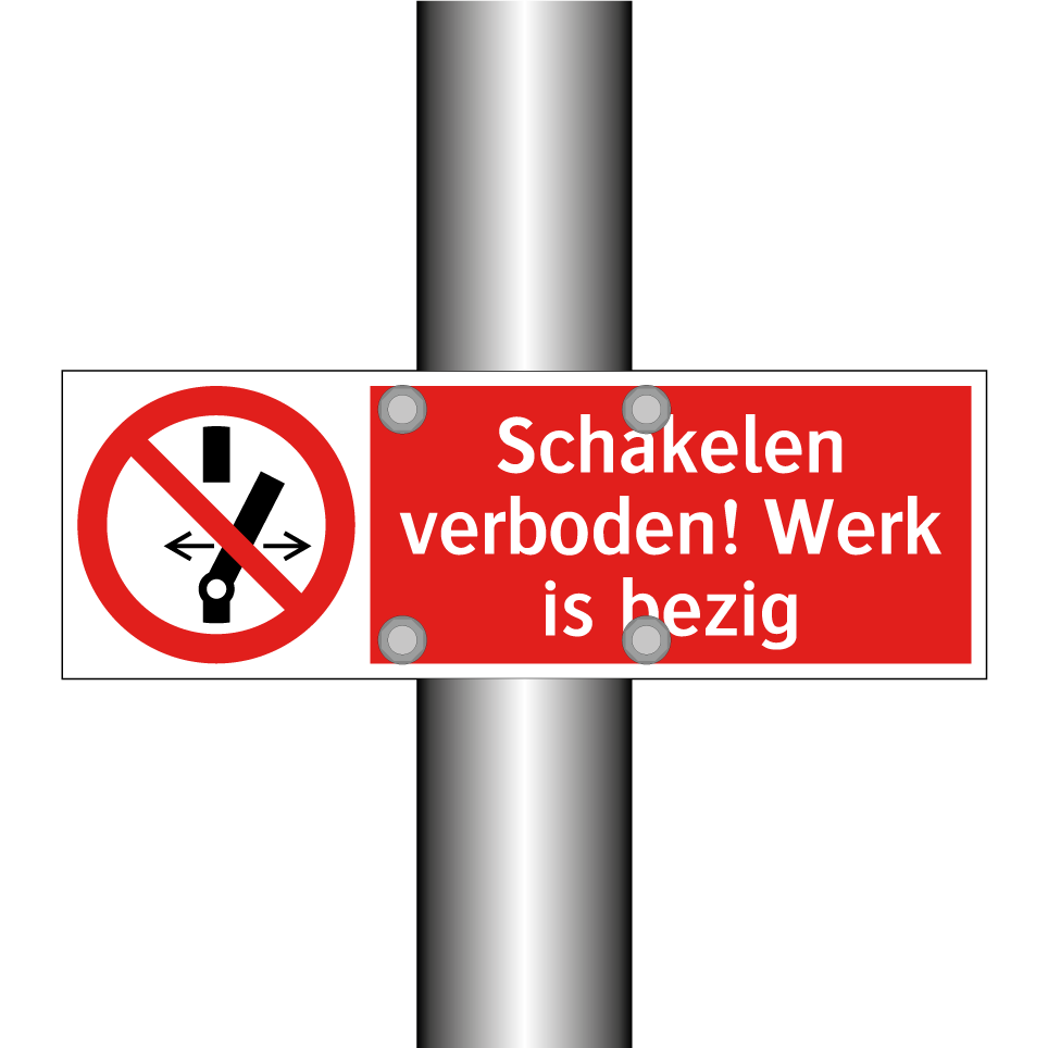 Verbodsbord met de tekst Schakelen verboden! Werk is bezig