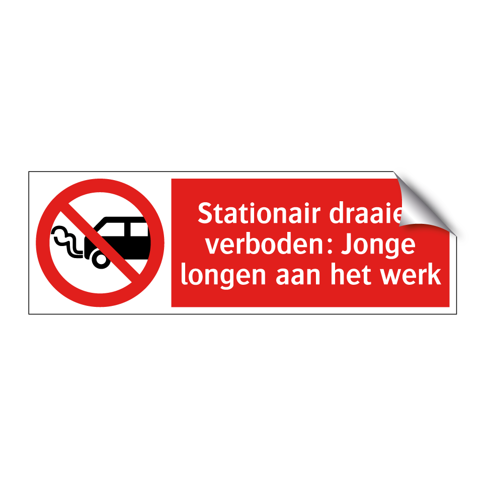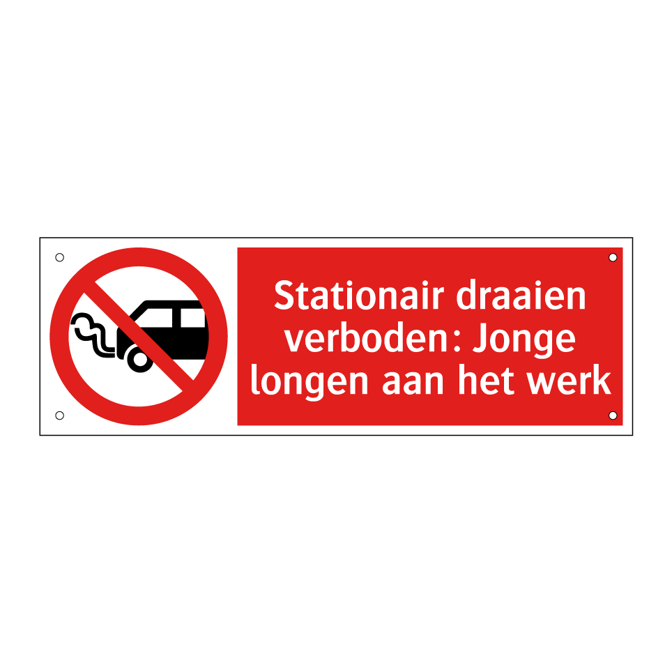 Verbodsbord met de tekst Stationair draaien verboden: Jonge longen aan het werk