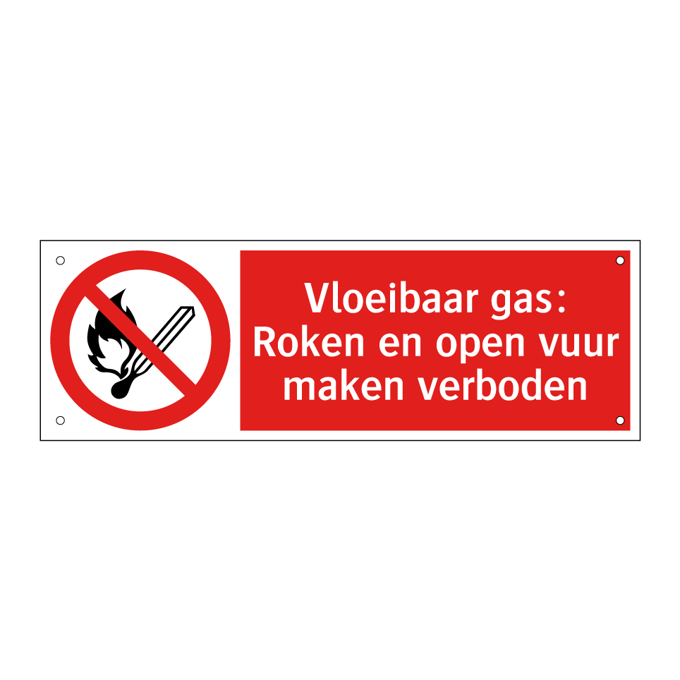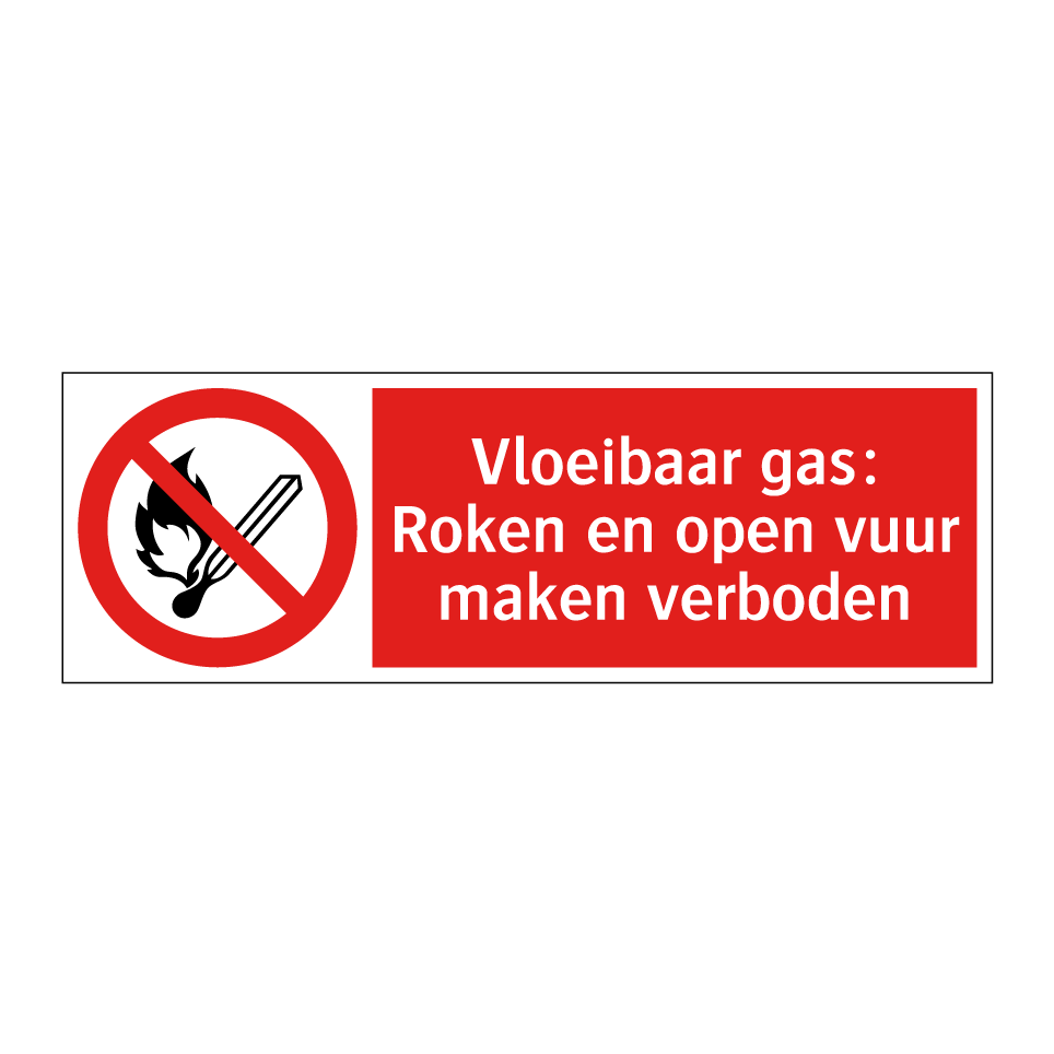 Verbodsbord met de tekst Vloeibaar gas: Roken en open vuur maken verboden
