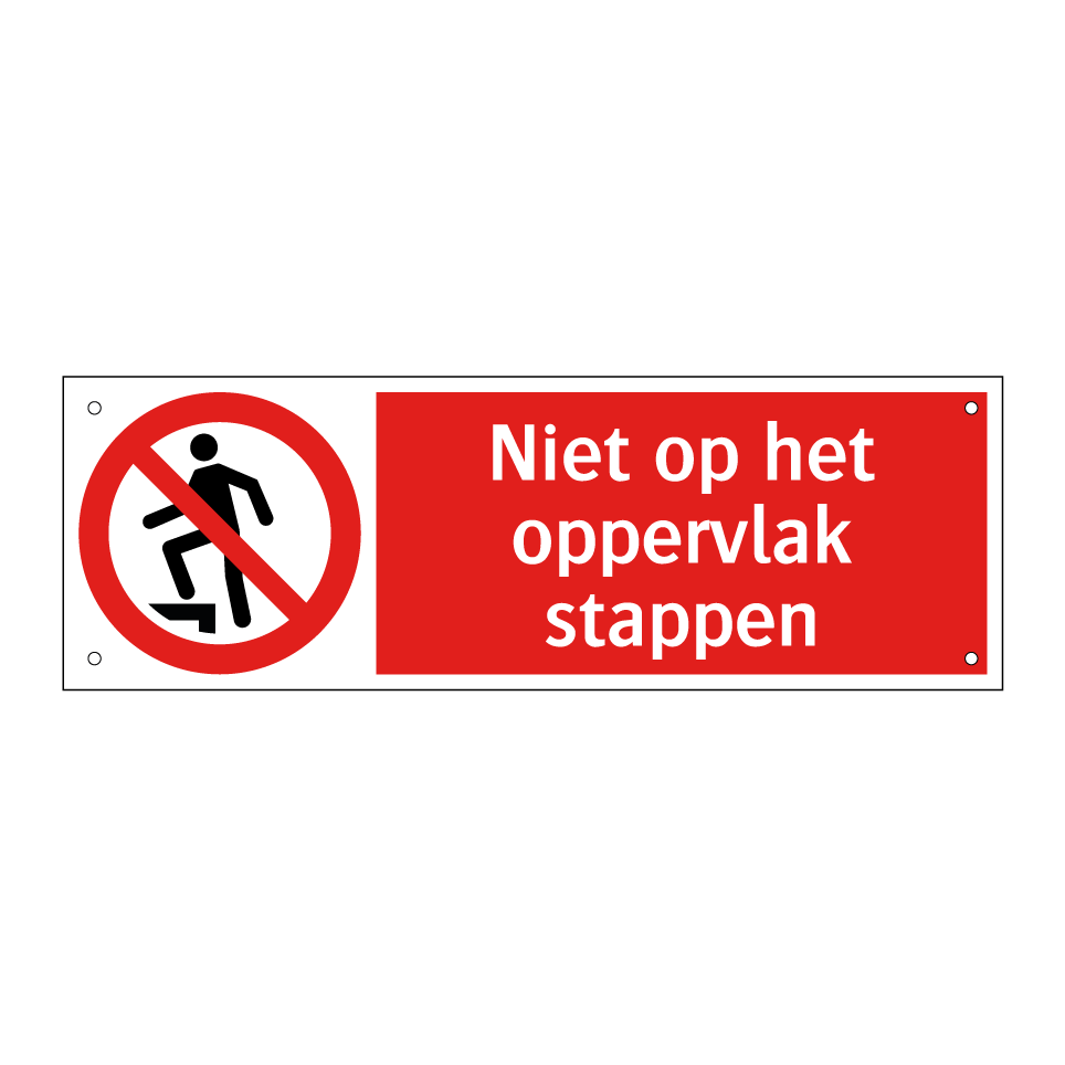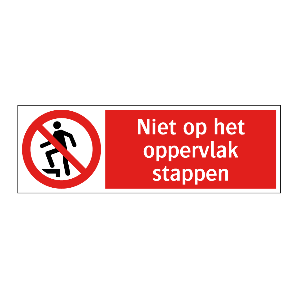 Deze opvallende verbodsbord is essentieel voor het waarborgen van veiligheid in diverse omgevingen. Het is ideaal voor gebruik in industriële gebieden, bouwplaatsen en magazijnen waar het cruciaal is om te voorkomen dat mensen op bepaalde oppervlakken stappen. Door de duidelijke rode achtergrond en witte tekst trekt het onmiddellijk de aandacht en communiceert het effectief het verbod. Plaats deze bord op strategische locaties zoals ingangen, trappen of andere risicovolle zones om ongelukken te voorkomen en de veiligheid te handhaven. Dit bord is een onmisbaar hulpmiddel voor het handhaven van orde en veiligheid in elke professionele omgeving.