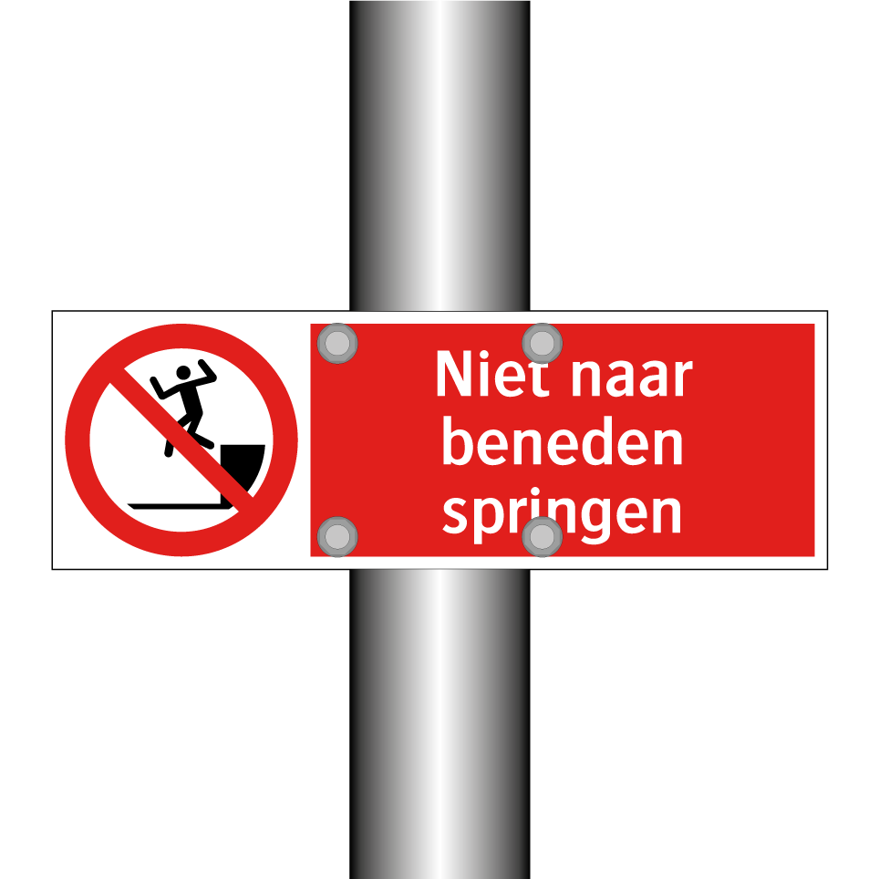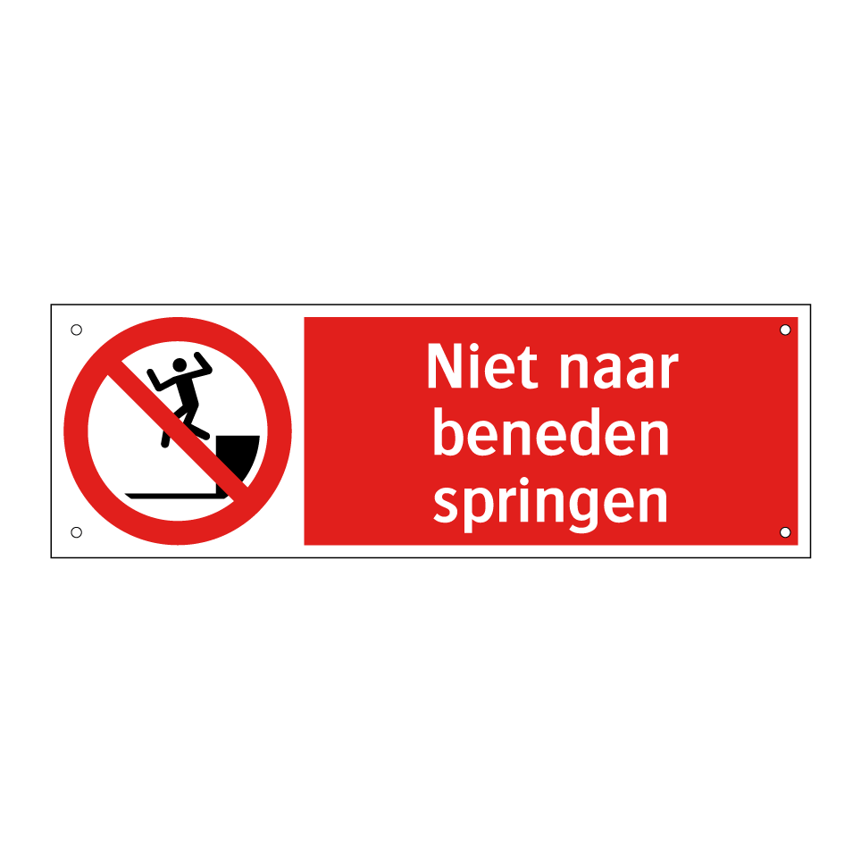 Deze opvallende verbodsbord is essentieel voor het waarborgen van de veiligheid in verschillende omgevingen. Het is ideaal voor gebruik op locaties waar het gevaarlijk is om van hoogte te springen, zoals bouwplaatsen, magazijnen of sportfaciliteiten. Door de duidelijke rode achtergrond en witte tekst trekt het onmiddellijk de aandacht en waarschuwt het effectief tegen risicovol gedrag. Plaats deze waarschuwingsbord op strategische plekken waar mensen geneigd kunnen zijn om van een hoogte te springen, zoals bij trappen, platforms of balkons. Het helpt ongelukken te voorkomen en bevordert een veilige omgeving voor iedereen.