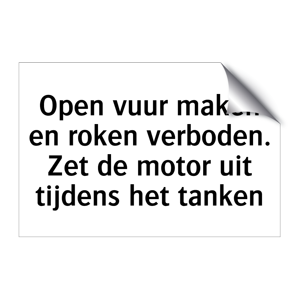 Verbodsbord met de tekst Open vuur maken en roken verboden. Zet de motor uit tijdens het tanken