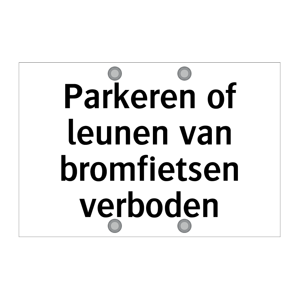 Verbodsbord met de tekst Parkeren of leunen van bromfietsen verboden