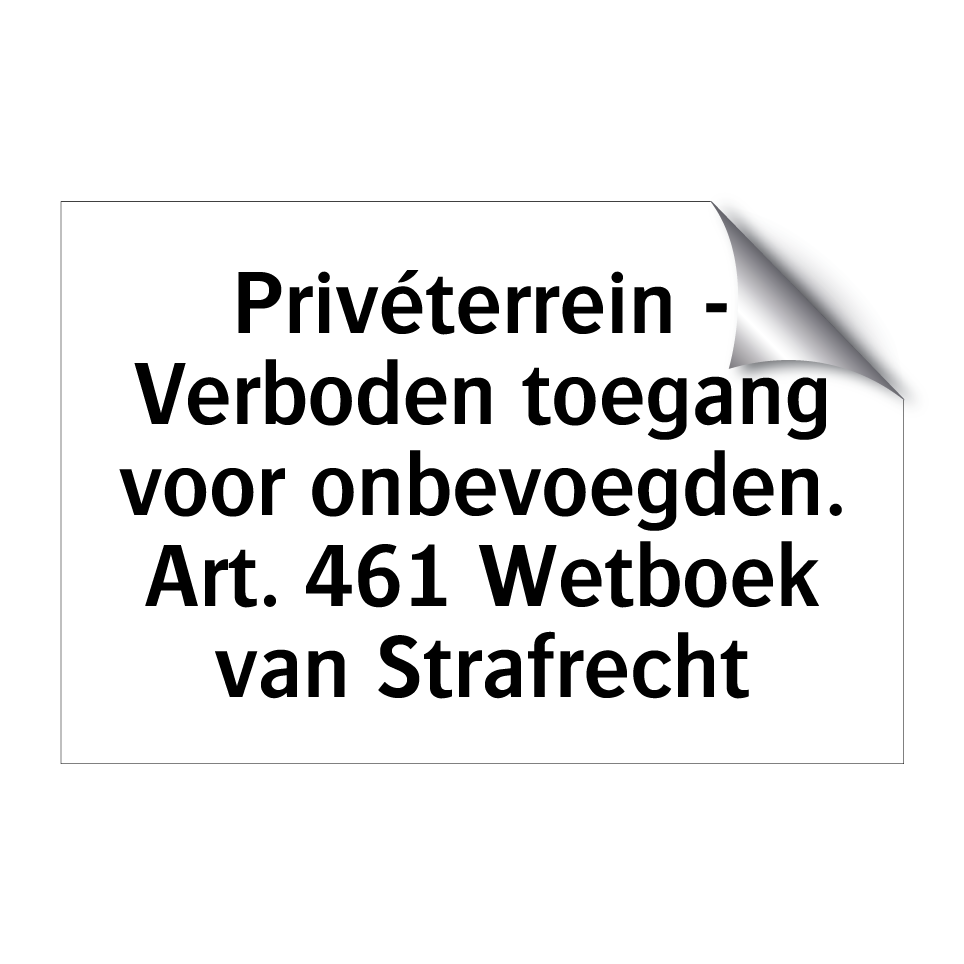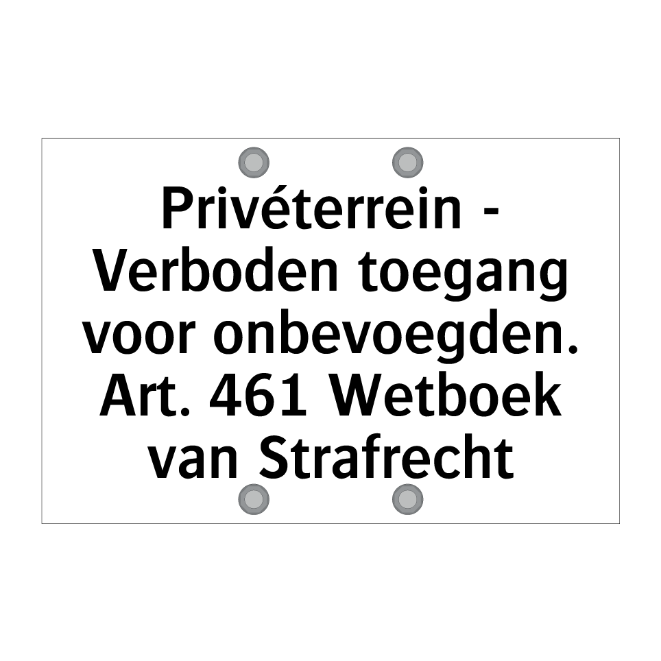 Verbodsbord met de tekst Privéterrein - Verboden toegang voor onbevoegden. Art. 461 Wetboek van Strafrecht