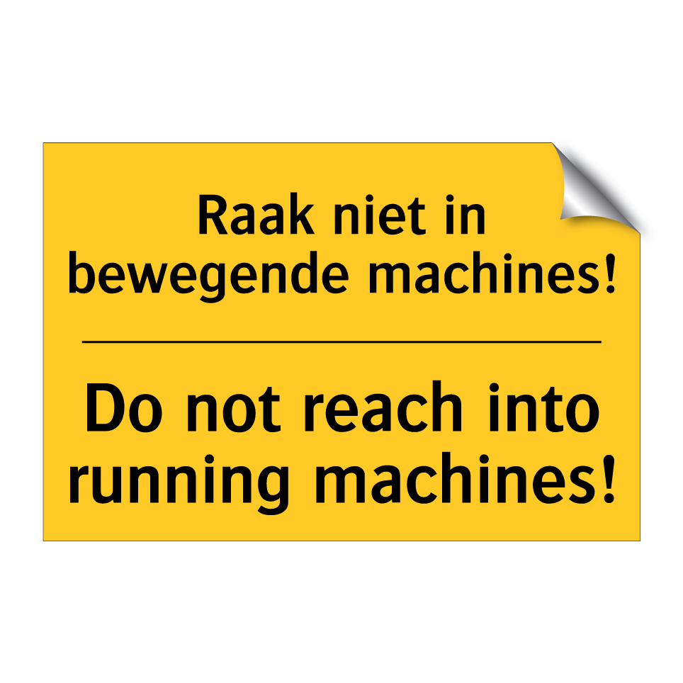 Waarschuwingsbord met de tekst Raak niet in bewegende machines! / Do not reach into running machines!
