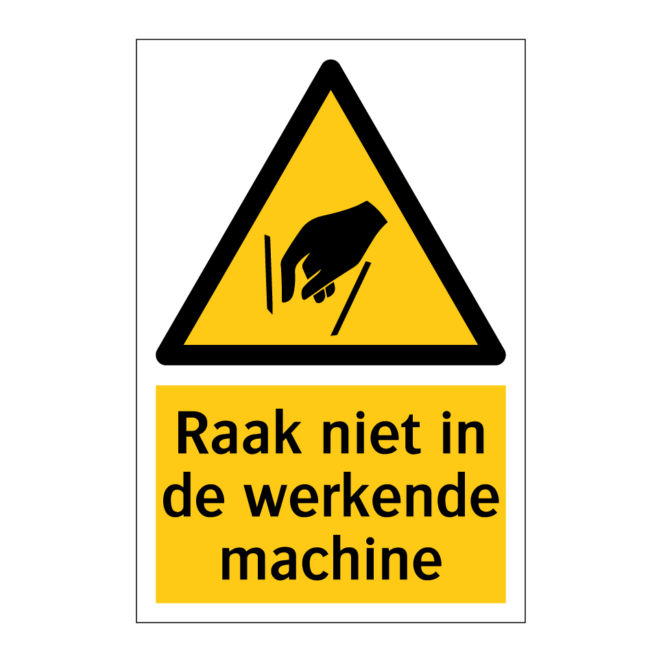 Waarschuwingsbord met de tekst Raak niet in de werkende machine