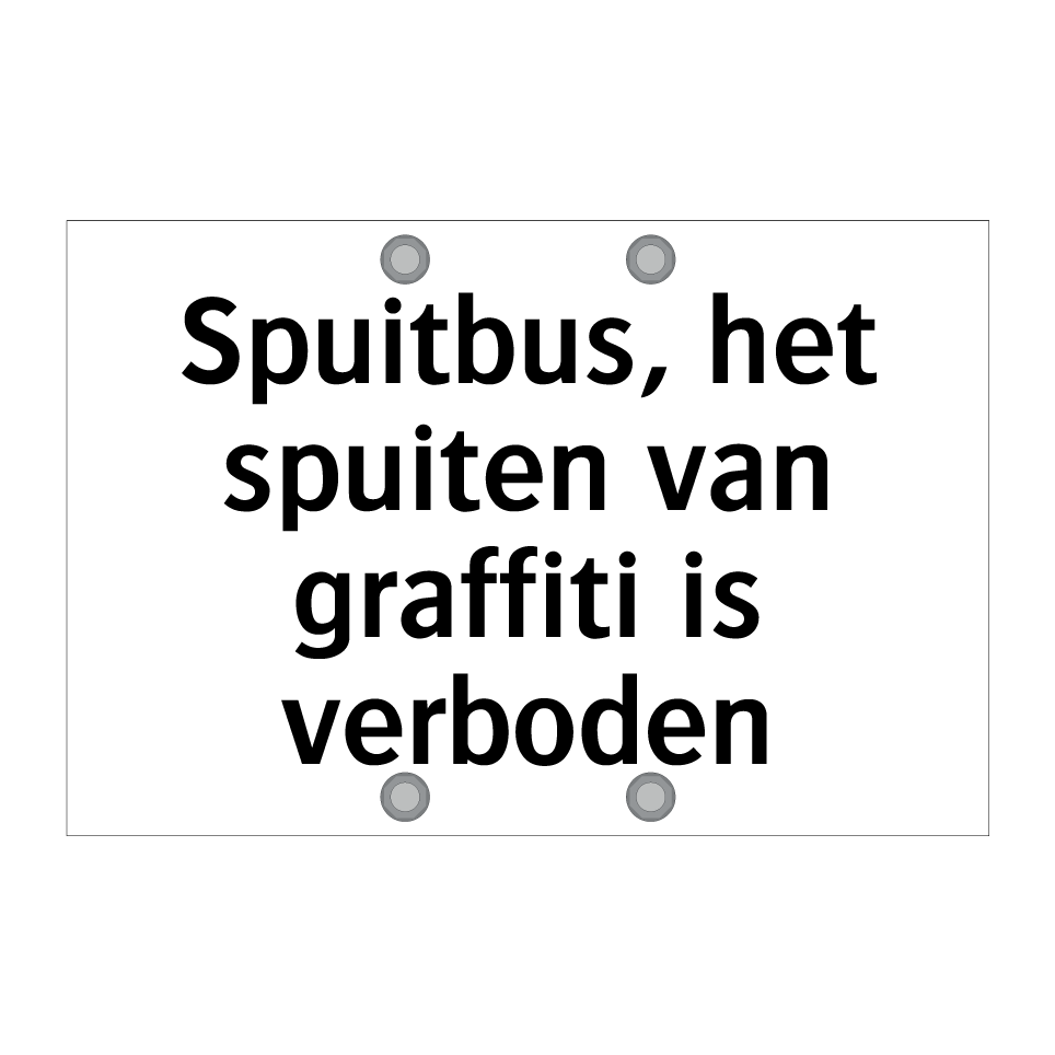 Deze verbodsbord is ideaal voor het ontmoedigen van ongewenst gedrag zoals graffiti spuiten. Het is een effectieve manier om duidelijk te maken dat het gebruik van spuitbussen in dit gebied niet is toegestaan. Plaats deze bord op strategische locaties zoals muren, hekken of ingangen van gebouwen waar vandalisme een probleem kan zijn. Door de duidelijke boodschap en opvallende kleuren trekt het direct de aandacht van voorbijgangers en potentiële overtreders. Dit bord is een essentiële toevoeging voor scholen, openbare ruimtes, parkeergarages en andere plekken waar het behoud van een nette omgeving belangrijk is.