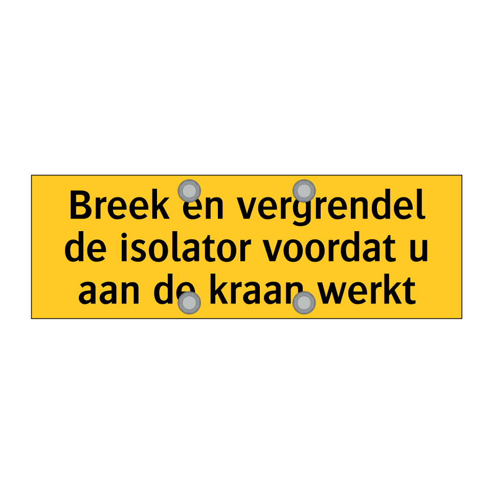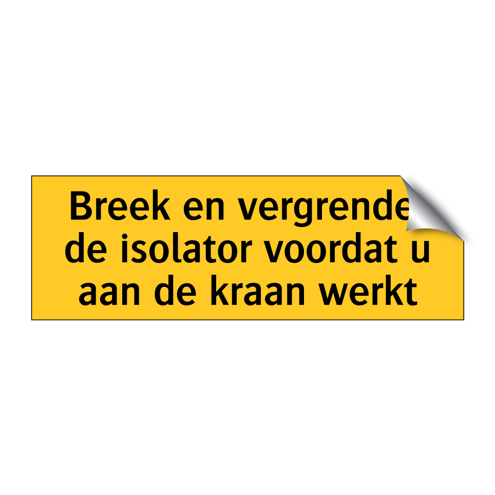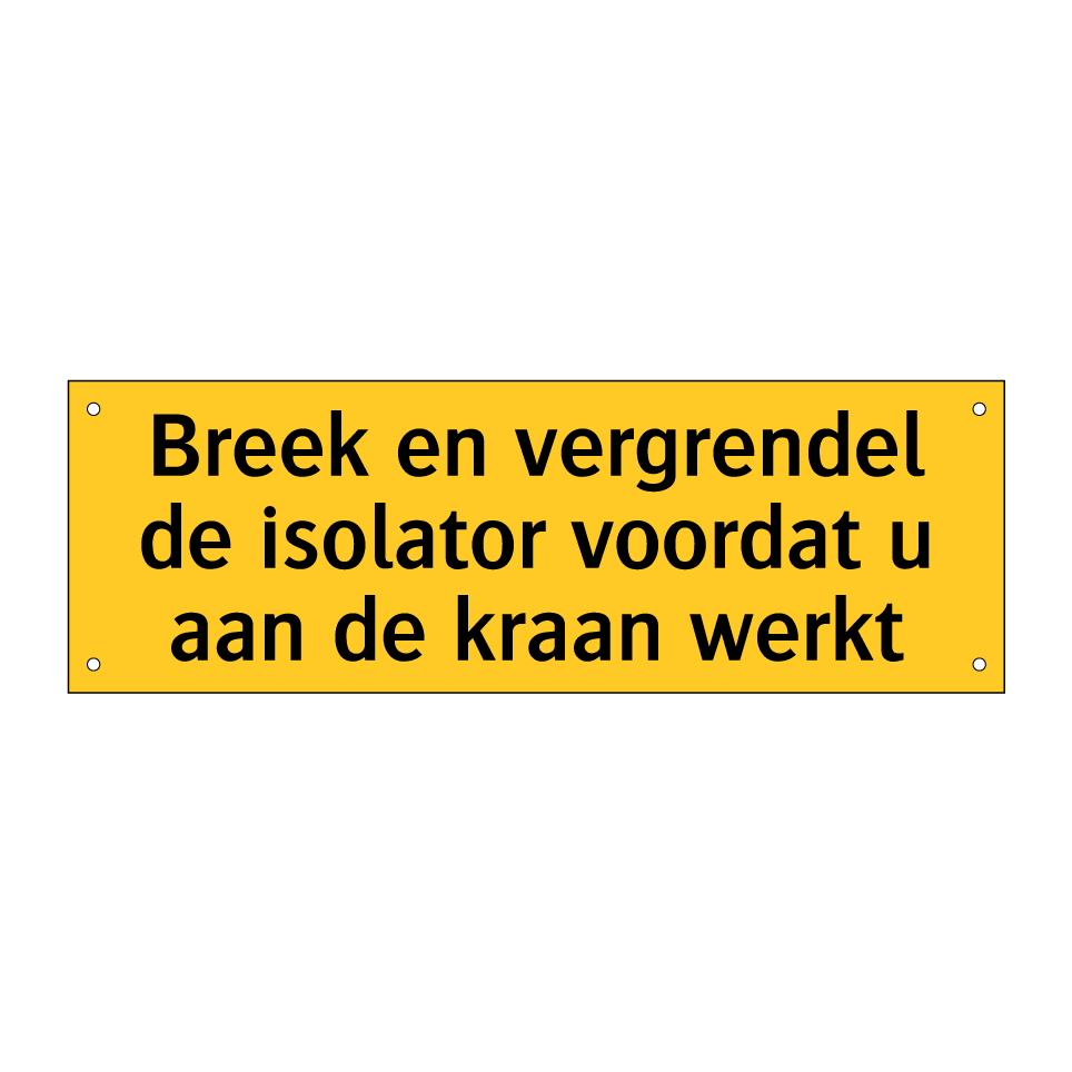 Waarschuwingsbord met de tekst Breek en vergrendel de isolator voordat u aan de kraan werkt