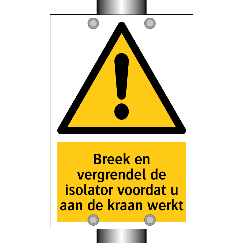 Waarschuwingsbord met de tekst Breek en vergrendel de isolator voordat u aan de kraan werkt