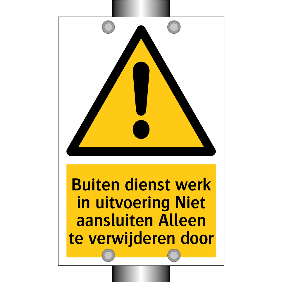 Waarschuwingsbord met de tekst Buiten dienst werk in uitvoering Niet aansluiten Alleen te verwijderen door