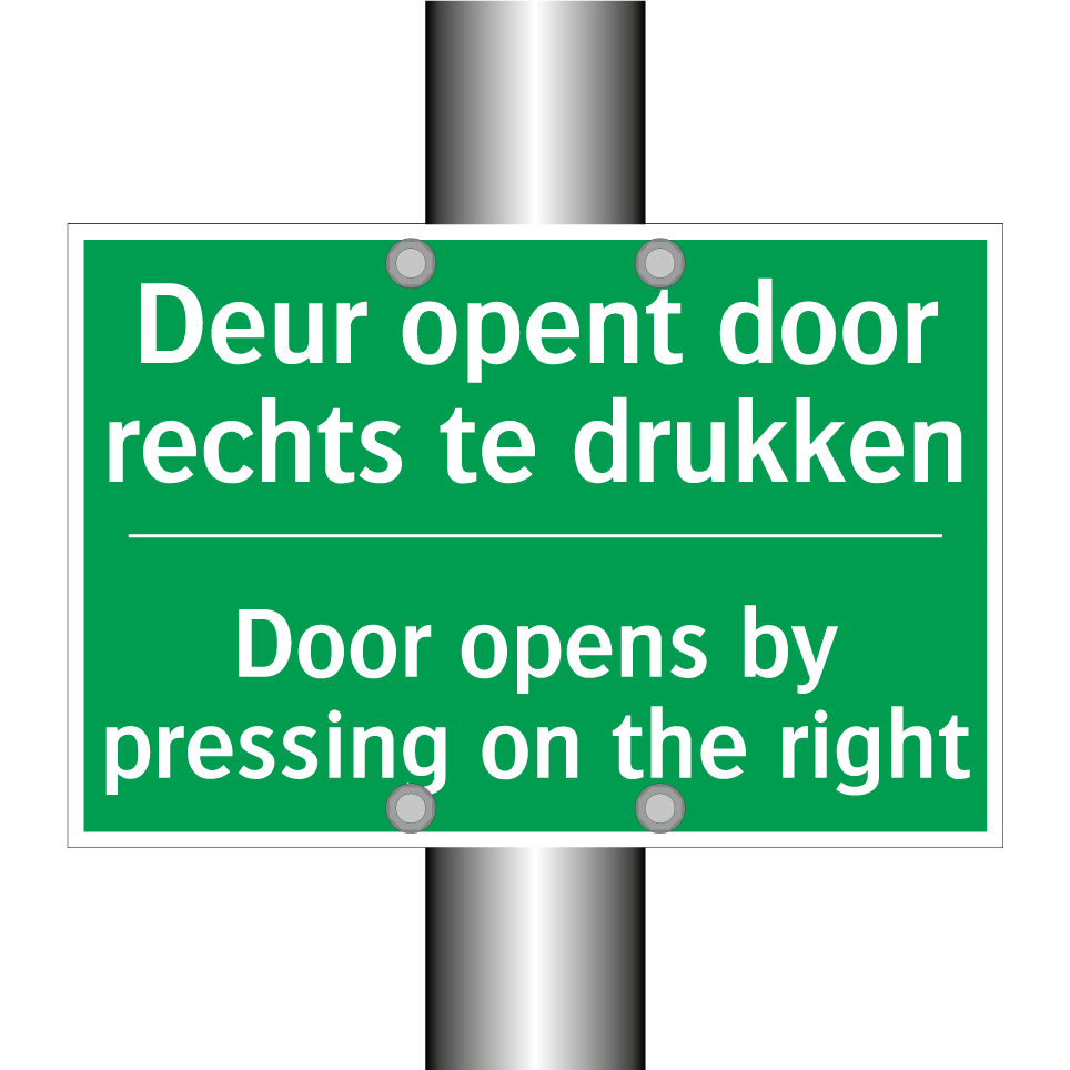 Noodbord met tekst Deur opent door rechts te drukken / Door opens by pressing on the right