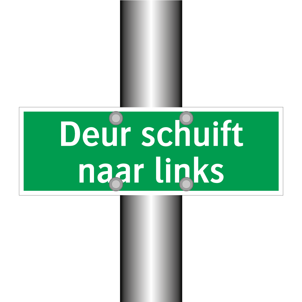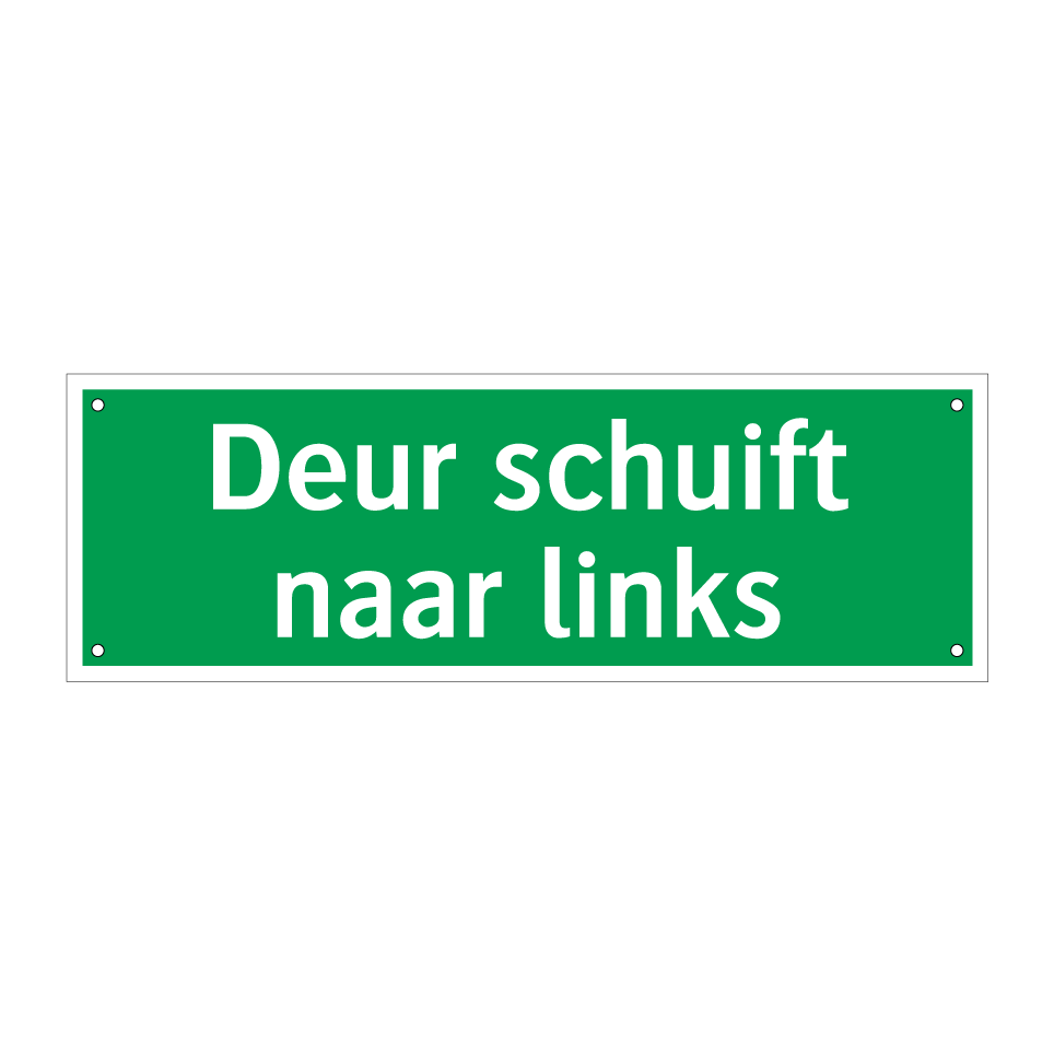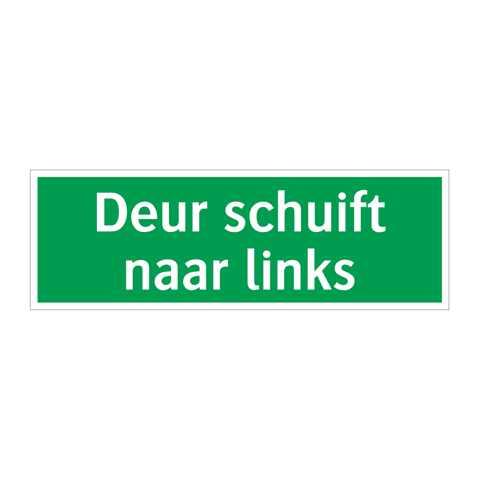 Onze noodbord is essentieel voor de veiligheid in elke omgeving. Deze groene bord met witte tekst geeft duidelijk aan dat de deur naar links schuift, wat cruciaal is in noodsituaties. Plaats deze noodbord bij uitgangen, gangen, en andere strategische locaties om ervoor te zorgen dat iedereen snel en veilig de juiste richting vindt. Ideaal voor gebruik in kantoren, scholen, ziekenhuizen en openbare gebouwen. Door deze bord op zichtbare plekken te plaatsen, verhoog je de veiligheid en zorg je voor een efficiënte evacuatie in geval van nood.