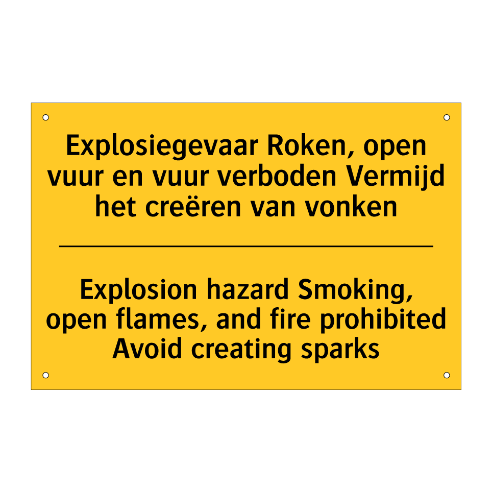 Waarschuwingsbord met de tekst Explosiegevaar Roken, open vuur en vuur verboden Vermijd het creëren van vonken / Explosion hazard Smoking, open flames, and fire prohibited Avoid creating sparks