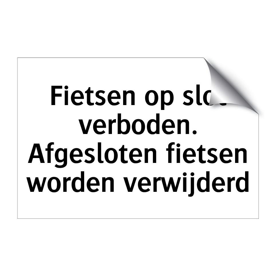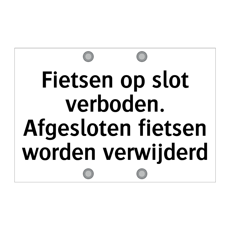 Verbodsbord met de tekst Fietsen op slot verboden. Afgesloten fietsen worden verwijderd
