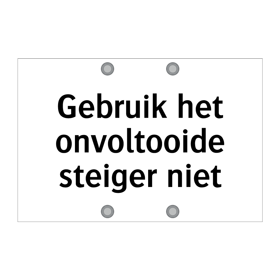 Verbodsbord met de tekst Gebruik het onvoltooide steiger niet