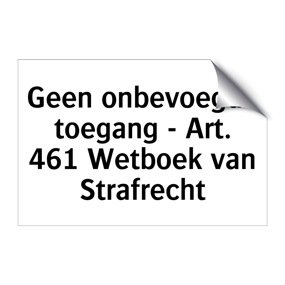 Verbodsbord met de tekst Geen onbevoegde toegang - Art. 461 Wetboek van Strafrecht