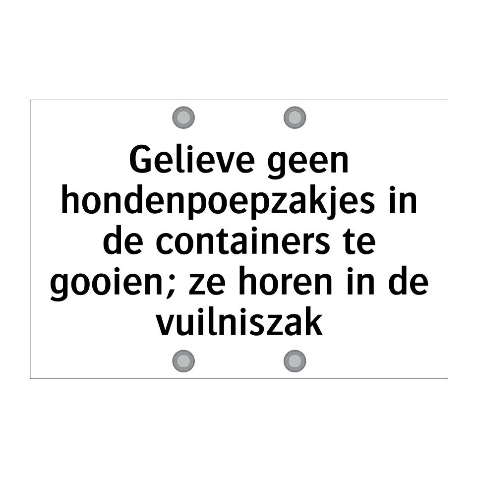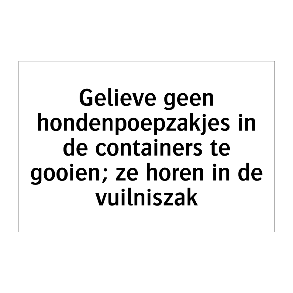 Verbodsbord met de tekst Gelieve geen hondenpoepzakjes in de containers te gooien; ze horen in de vuilniszak