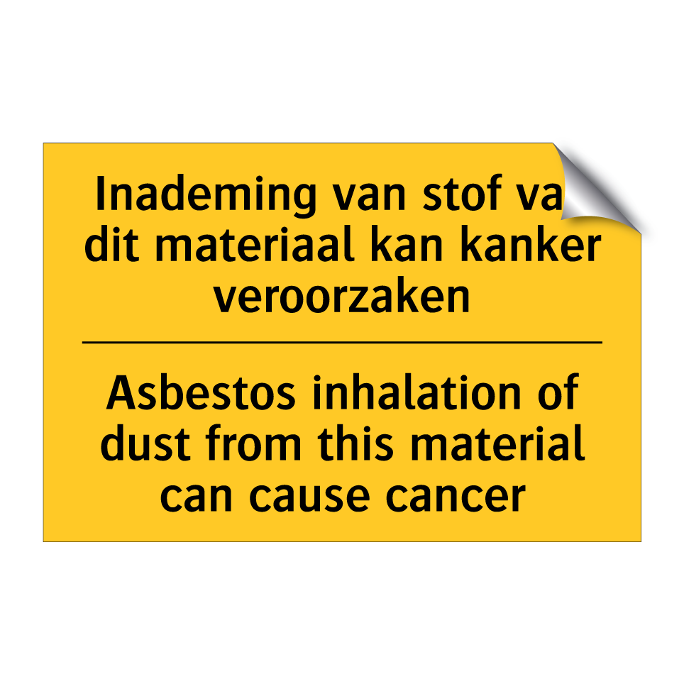 Waarschuwingsbord met de tekst Inademing van stof van dit materiaal kan kanker veroorzaken / Asbestos inhalation of dust from this material can cause cancer