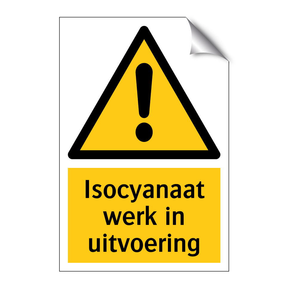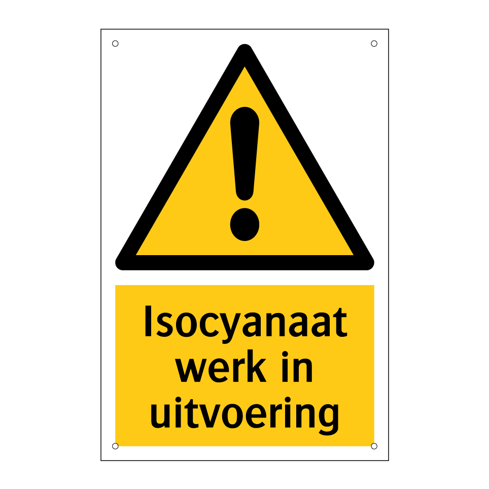 Waarschuwingsbord met de tekst Isocyanaat werk in uitvoering