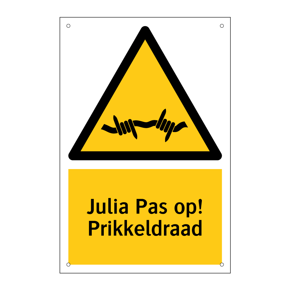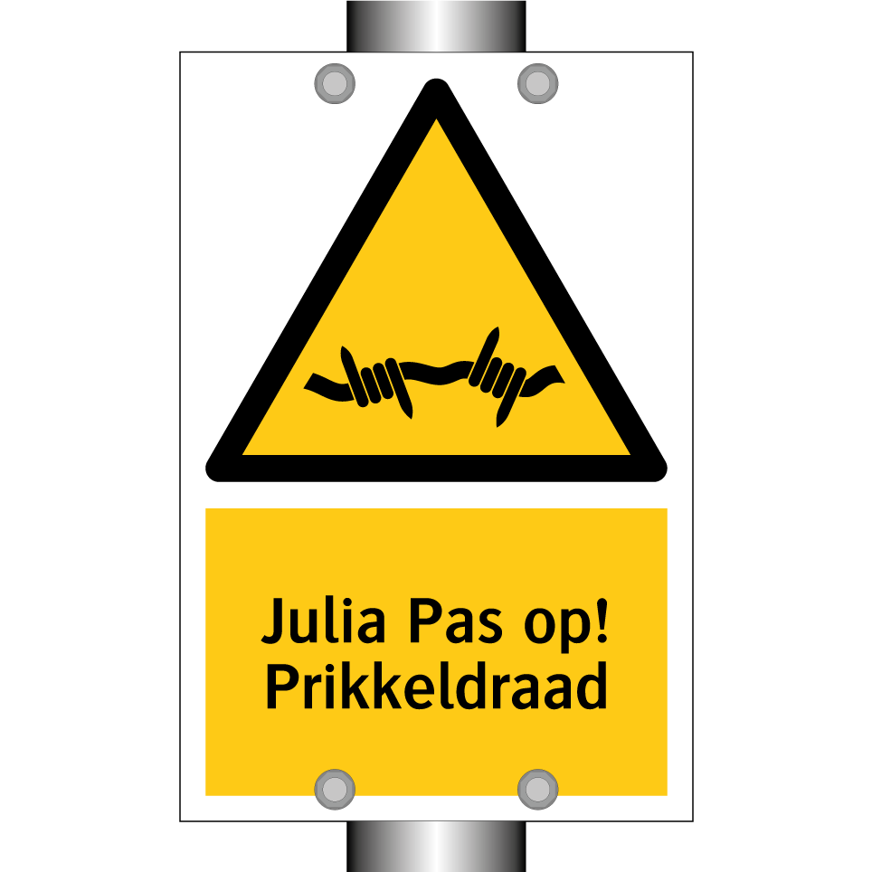 Waarschuwingsbord met de tekst Julia Pas op! Prikkeldraad
