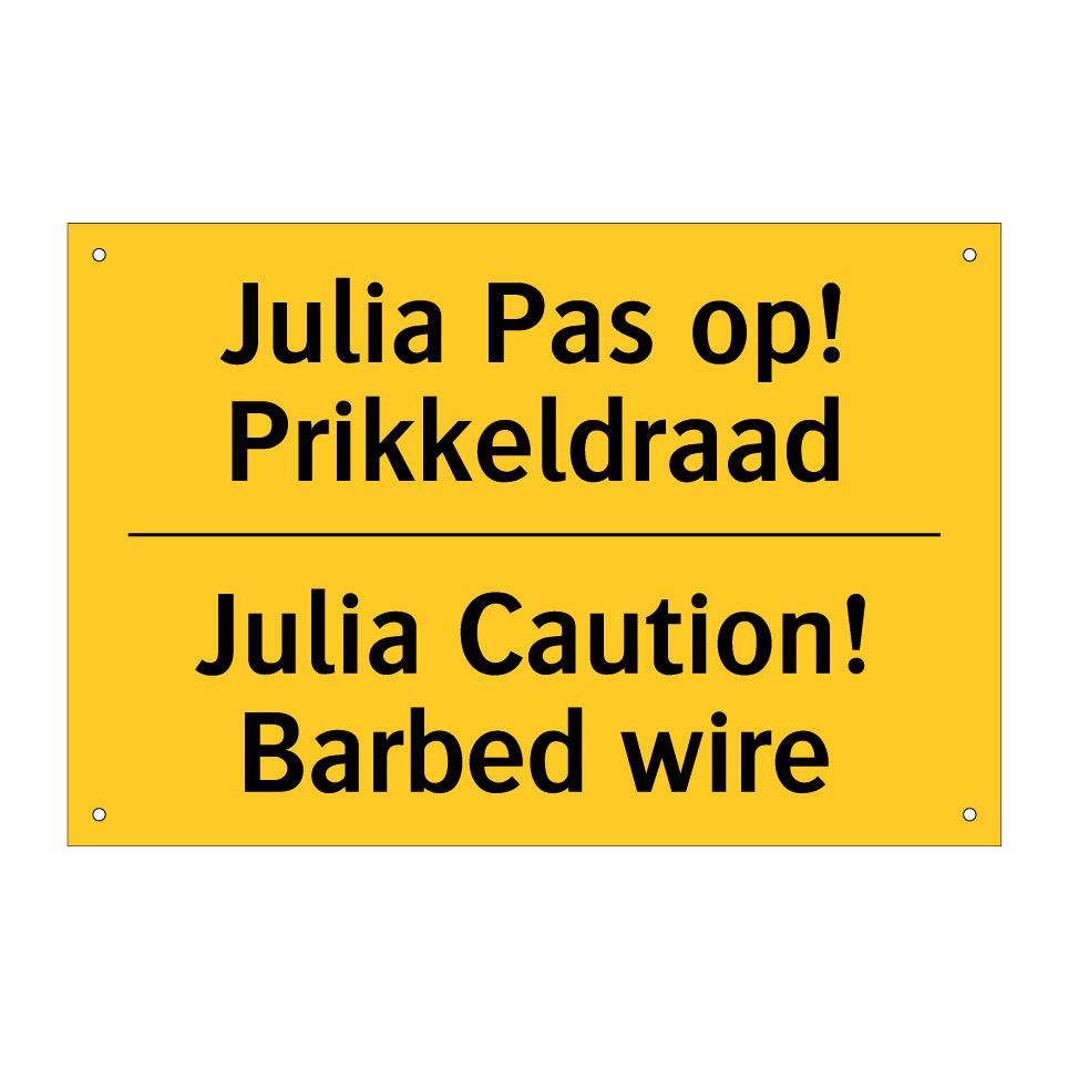 Waarschuwingsbord met de tekst Julia Pas op! Prikkeldraad / Julia Caution! Barbed wire