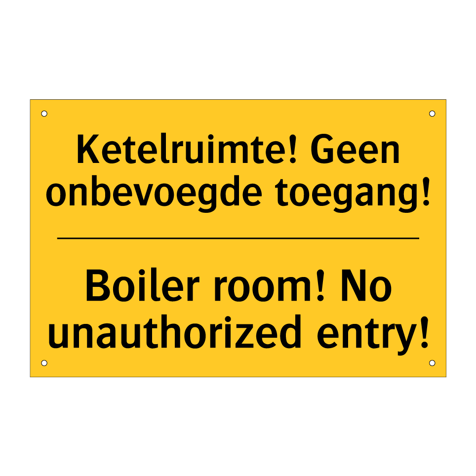 Waarschuwingsbord met de tekst Ketelruimte! Geen onbevoegde toegang! / Boiler room! No unauthorized entry!