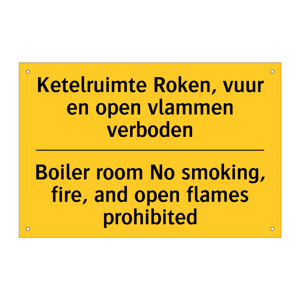 Waarschuwingsbord met de tekst Ketelruimte Roken, vuur en open vlammen verboden / Boiler room No smoking, fire, and open flames prohibited