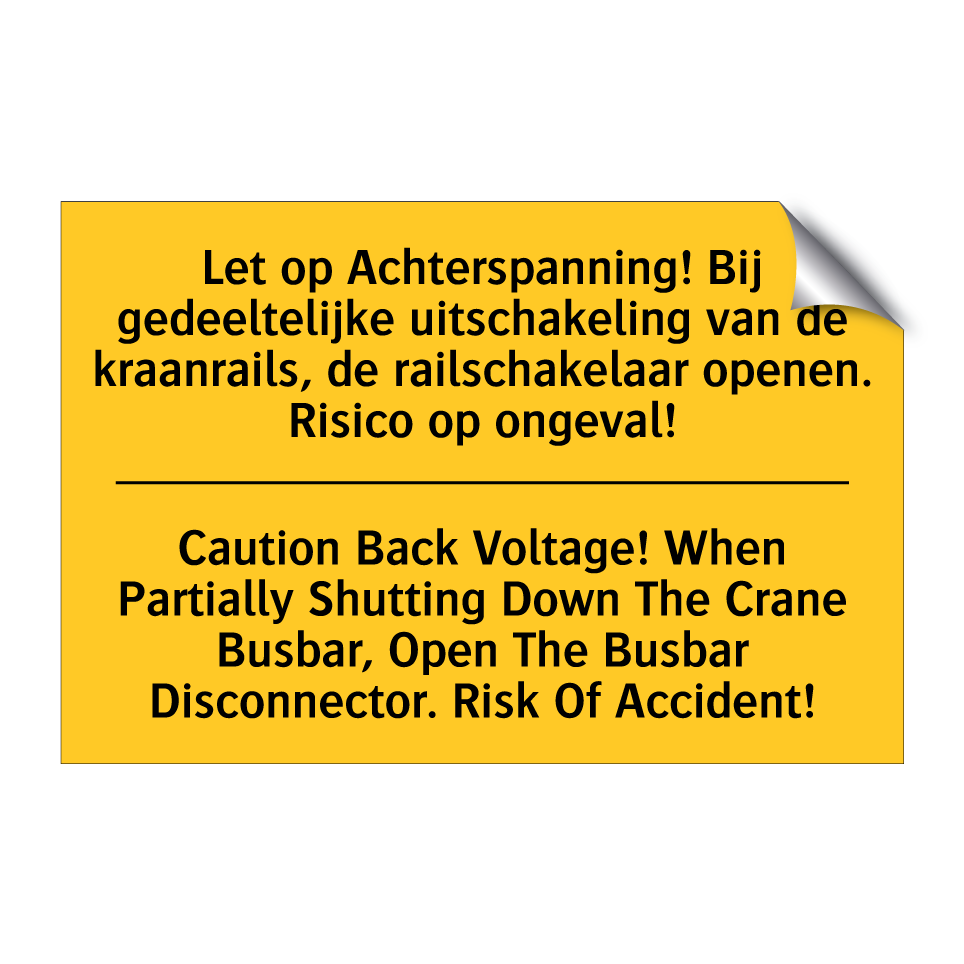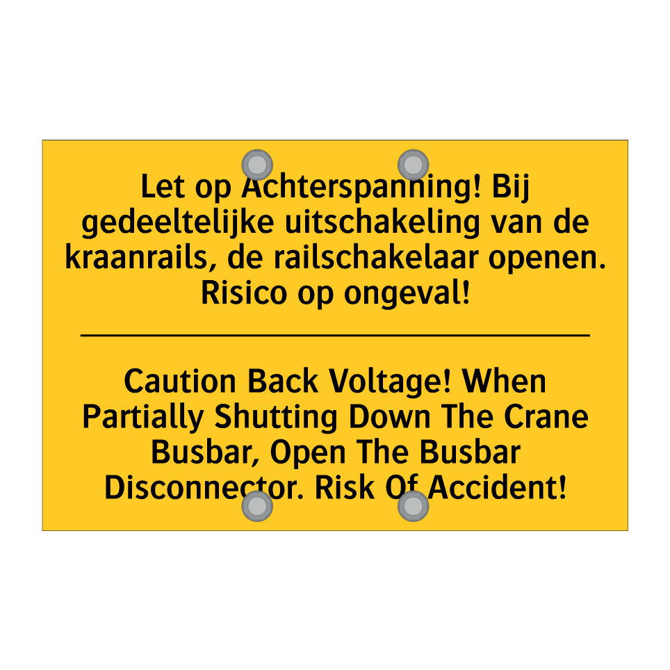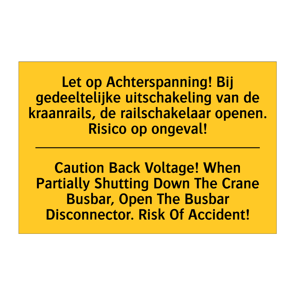 Waarschuwingsbord met de tekst Let op Achterspanning! Bij gedeeltelijke uitschakeling van de kraanrails, de railschakelaar openen. Risico op ongeval! / Caution Back Voltage! When Partially Shutting Down The Crane Busbar, Open The Busbar Disconnector. Risk Of Accident!
