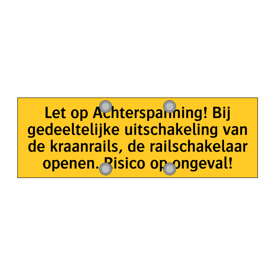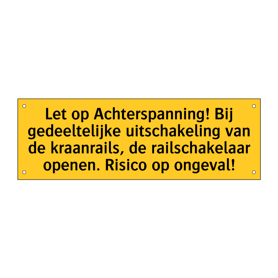 Waarschuwingsbord met de tekst Let op Achterspanning! Bij gedeeltelijke uitschakeling van de kraanrails, de railschakelaar openen. Risico op ongeval!