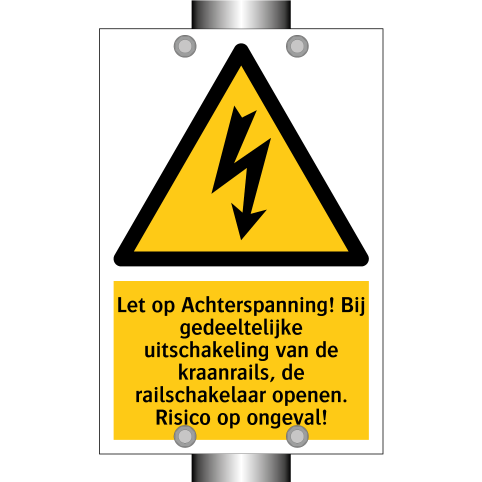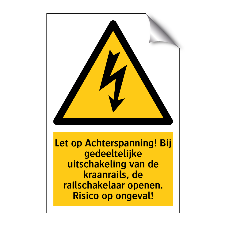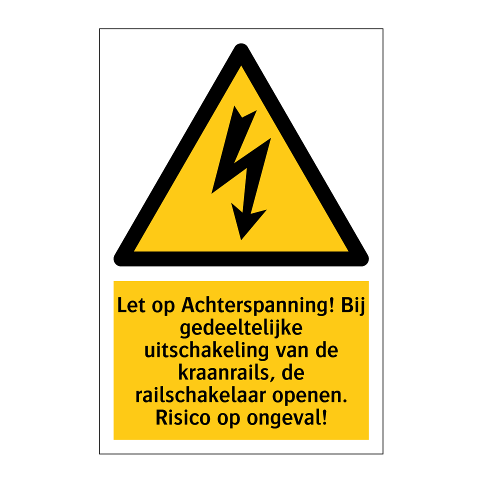 Waarschuwingsbord met de tekst Let op Achterspanning! Bij gedeeltelijke uitschakeling van de kraanrails, de railschakelaar openen. Risico op ongeval!