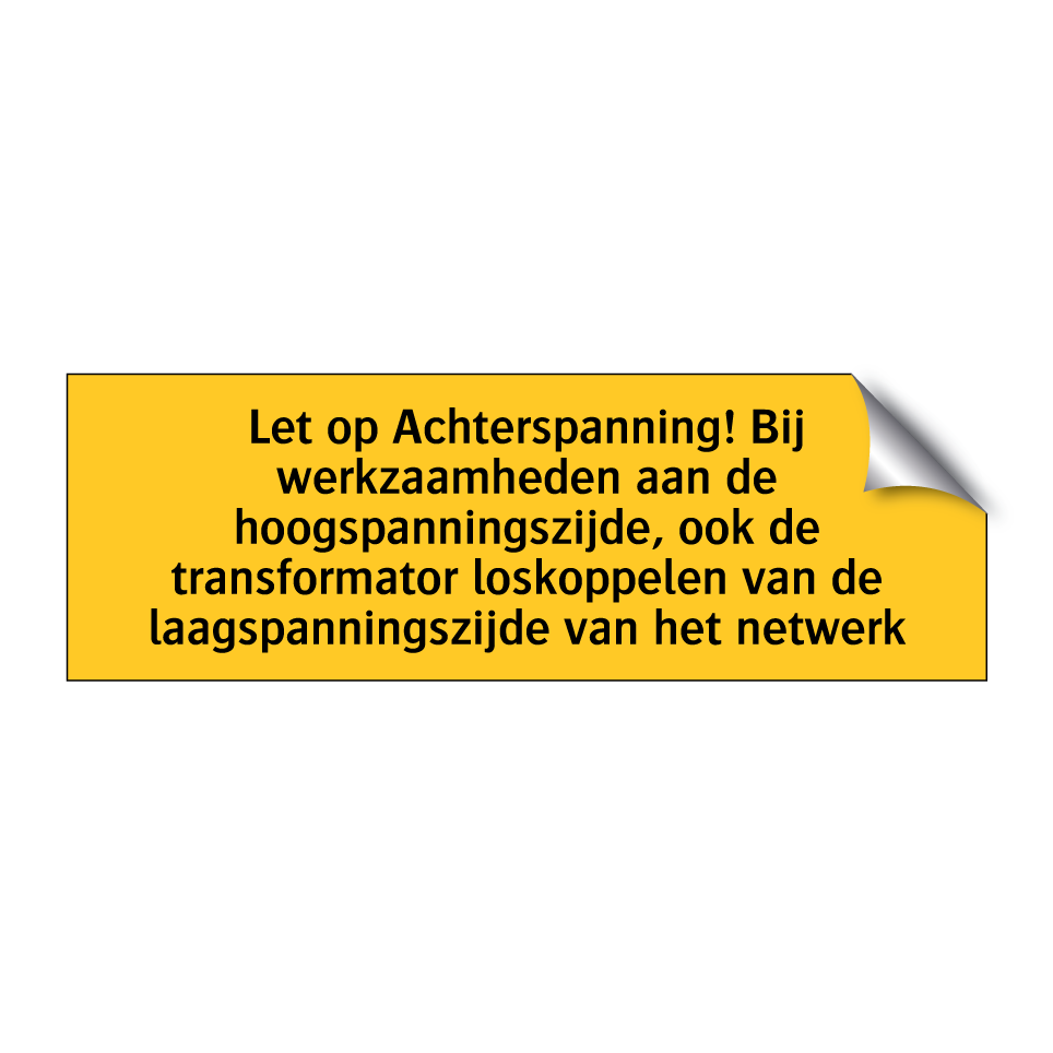 Waarschuwingsbord met de tekst Let op Achterspanning! Bij werkzaamheden aan de hoogspanningszijde, ook de transformator loskoppelen van de laagspanningszijde van het netwerk