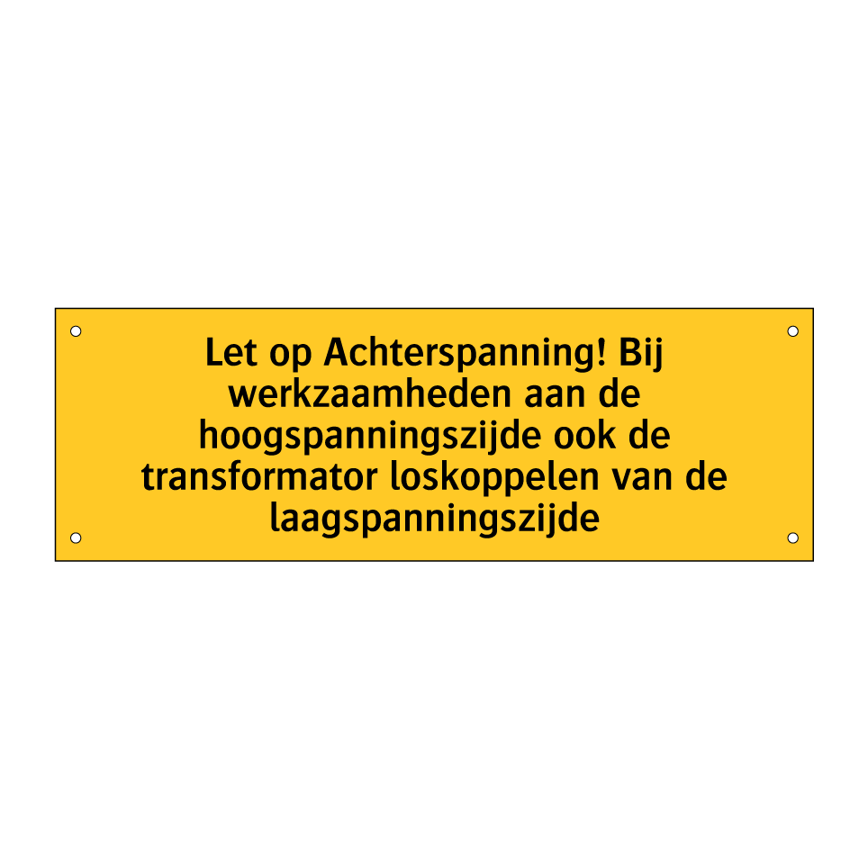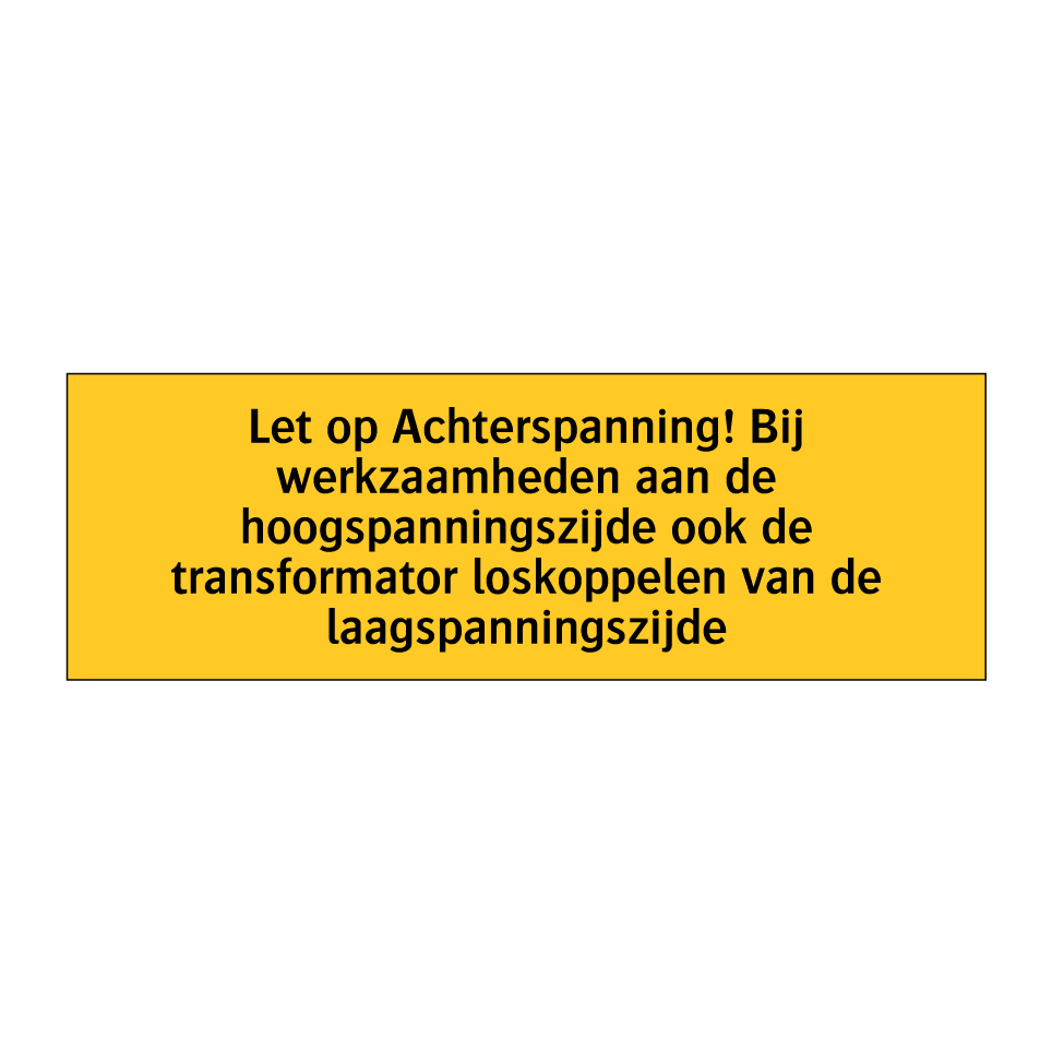 Waarschuwingsbord met de tekst Let op Achterspanning! Bij werkzaamheden aan de hoogspanningszijde ook de transformator loskoppelen van de laagspanningszijde