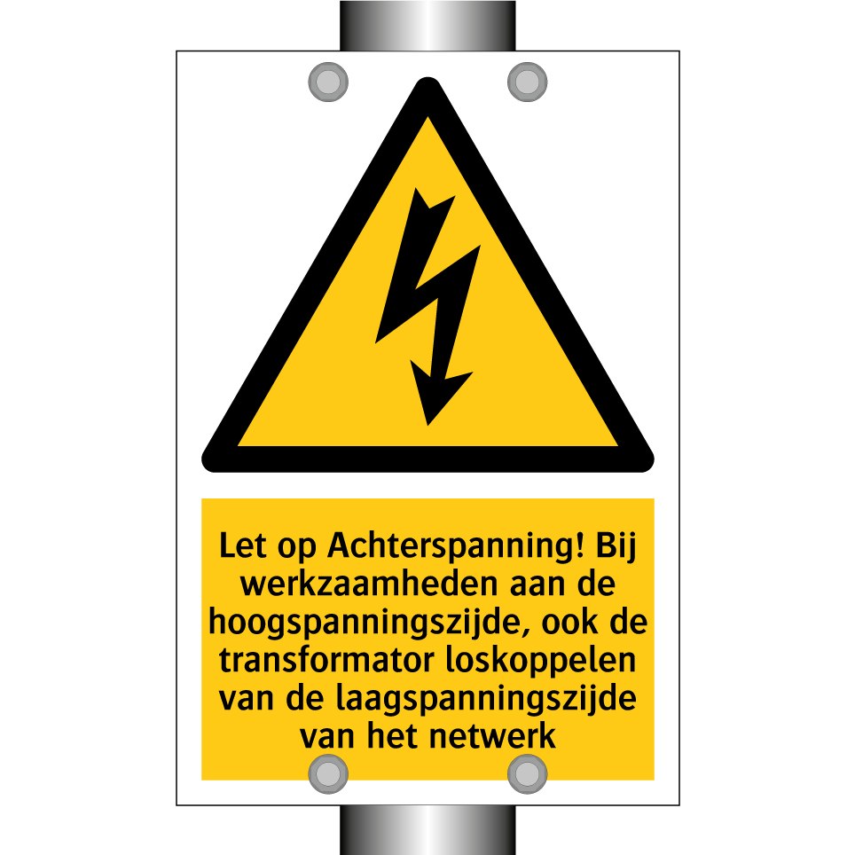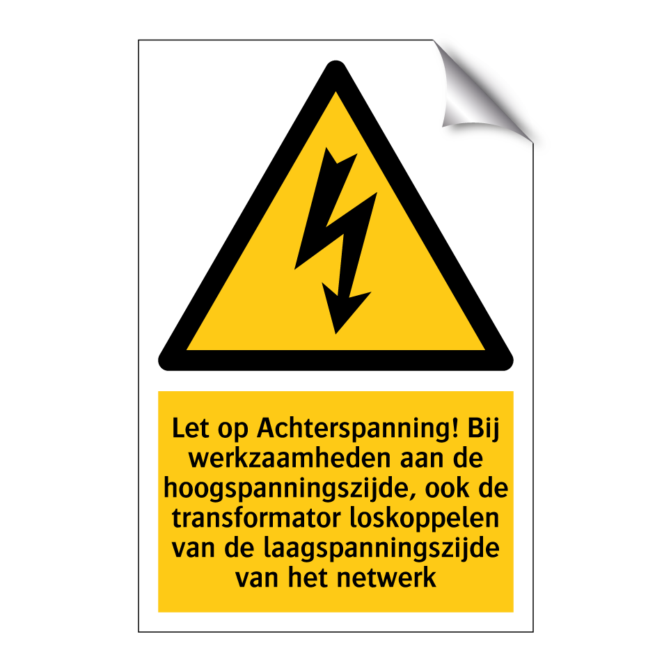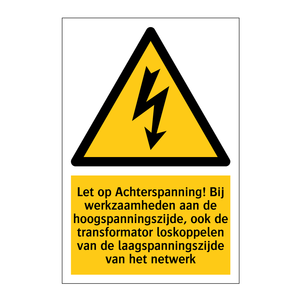 Waarschuwingsbord met de tekst Let op Achterspanning! Bij werkzaamheden aan de hoogspanningszijde, ook de transformator loskoppelen van de laagspanningszijde van het netwerk