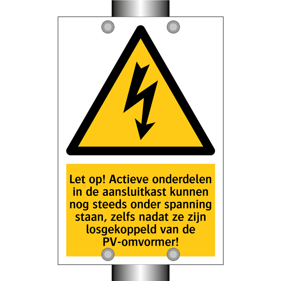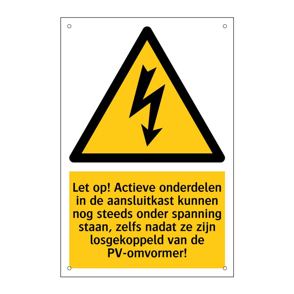 Waarschuwingsbord met de tekst Let op! Actieve onderdelen in de aansluitkast kunnen nog steeds onder spanning staan, zelfs nadat ze zijn losgekoppeld van de PV-omvormer!