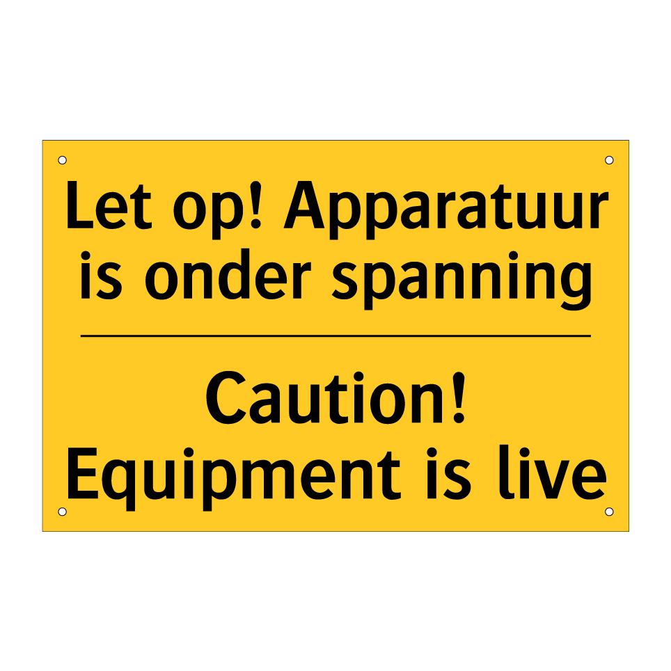 Waarschuwingsbord met de tekst Let op! Apparatuur is onder spanning / Caution! Equipment is live