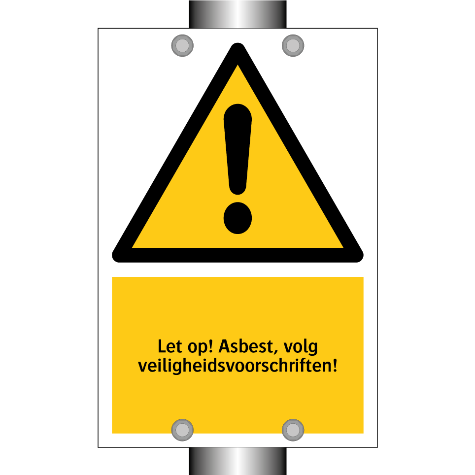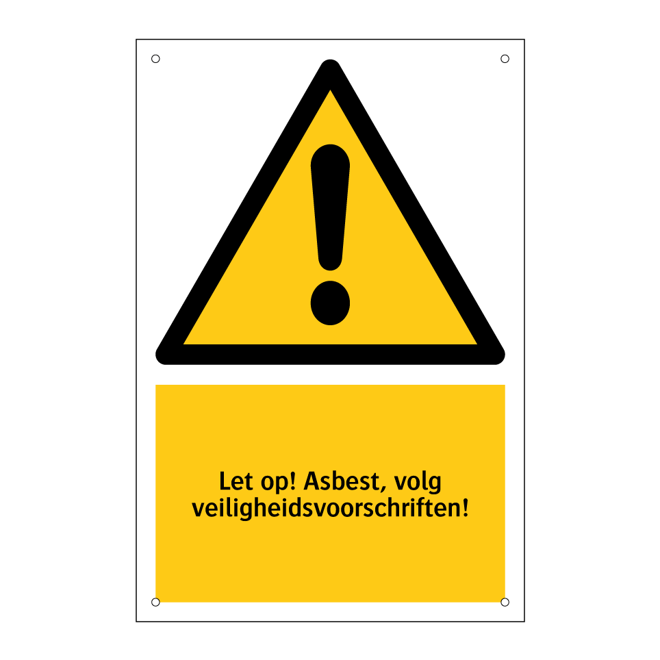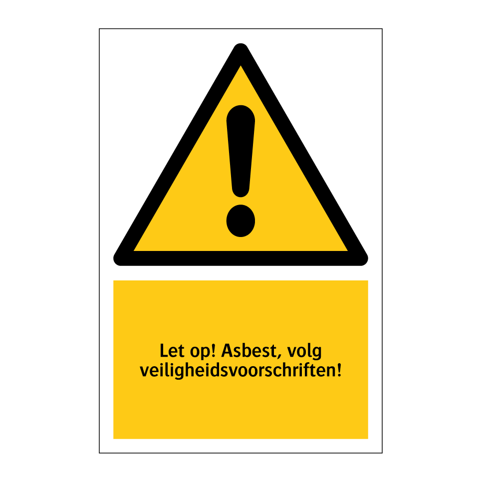 Waarschuwingsbord met de tekst Let op! Asbest, volg veiligheidsvoorschriften!
