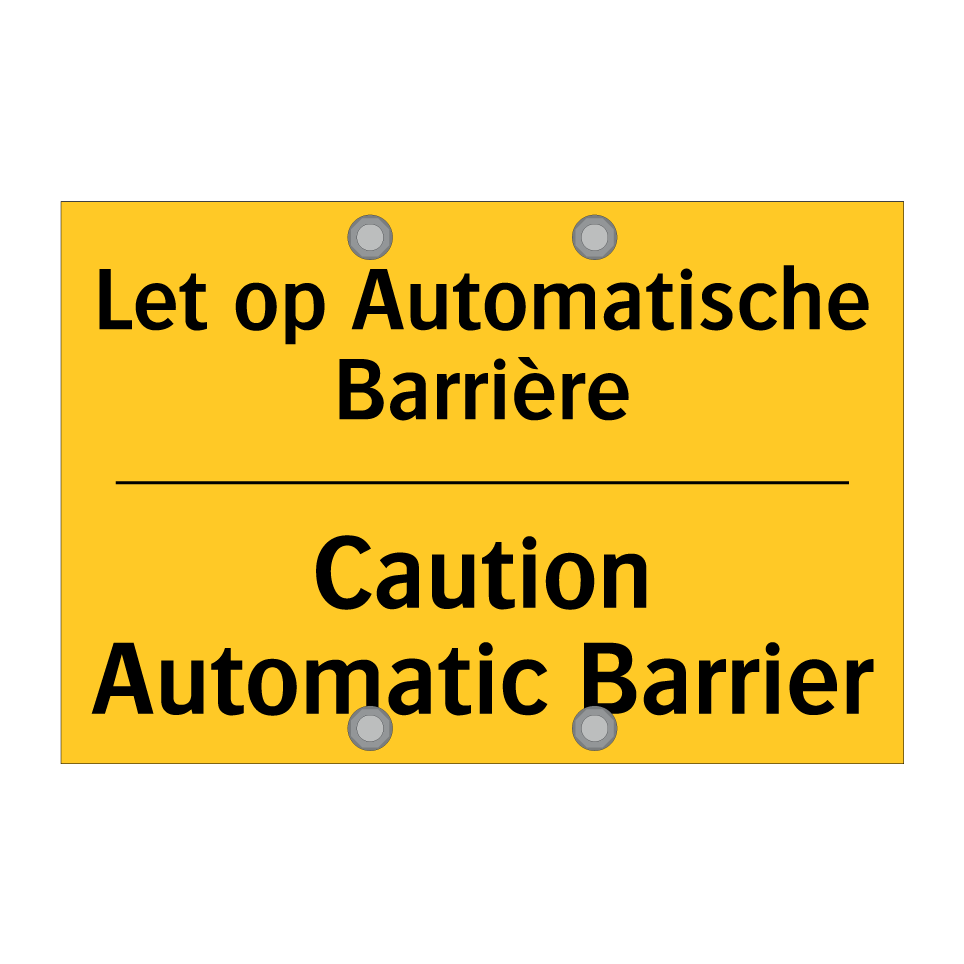 Waarschuwingsbord met de tekst Let op Automatische Barrière / Caution Automatic Barrier