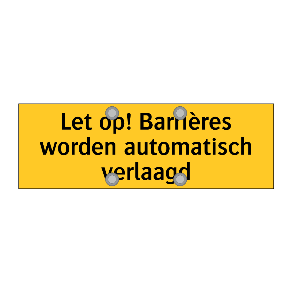 Waarschuwingsbord met de tekst Let op! Barrières worden automatisch verlaagd