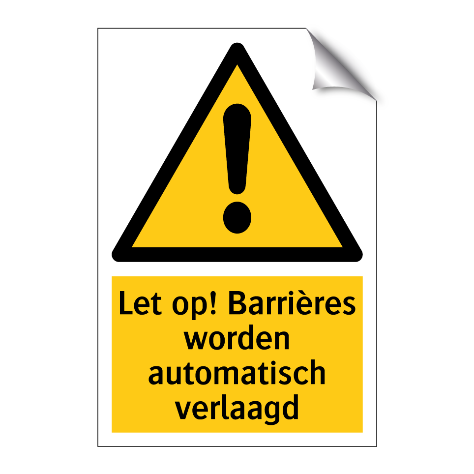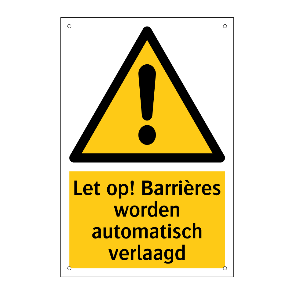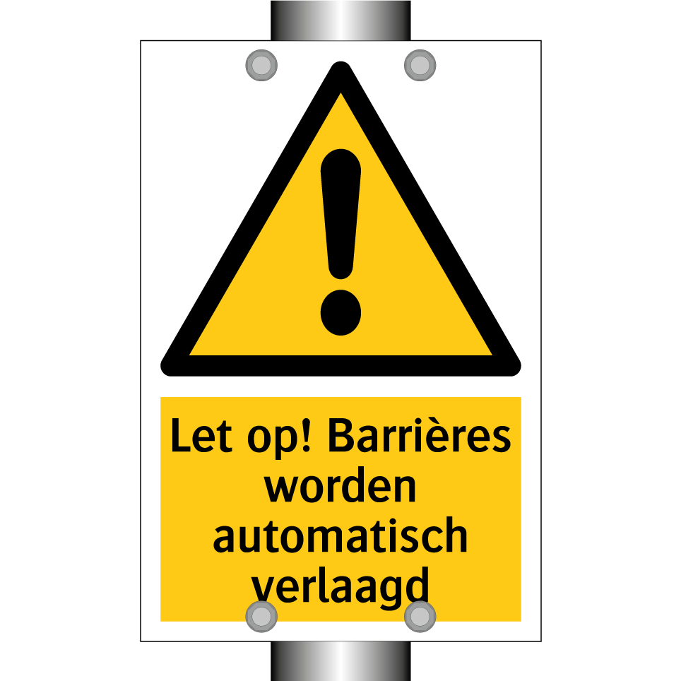 Waarschuwingsbord met de tekst Let op! Barrières worden automatisch verlaagd