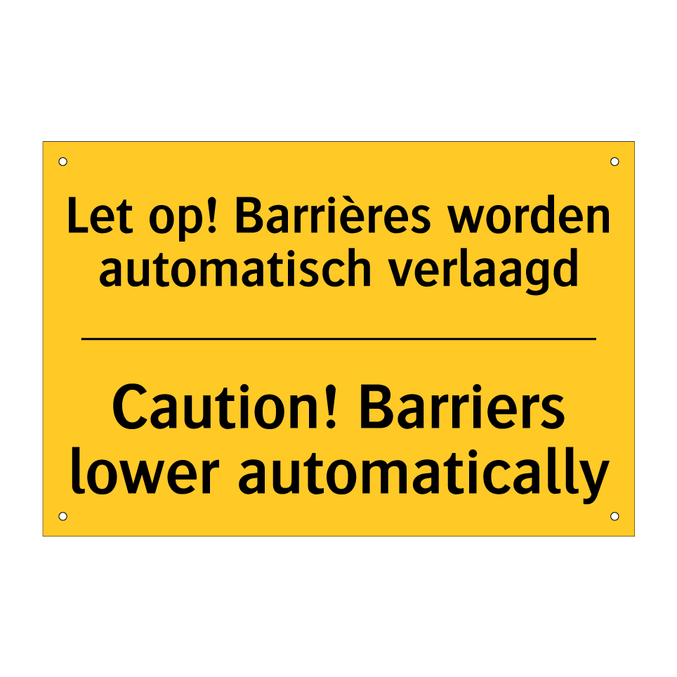 Waarschuwingsbord met de tekst Let op! Barrières worden automatisch verlaagd / Caution! Barriers lower automatically