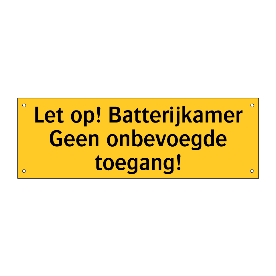 Waarschuwingsbord met de tekst Let op! Batterijkamer Geen onbevoegde toegang!