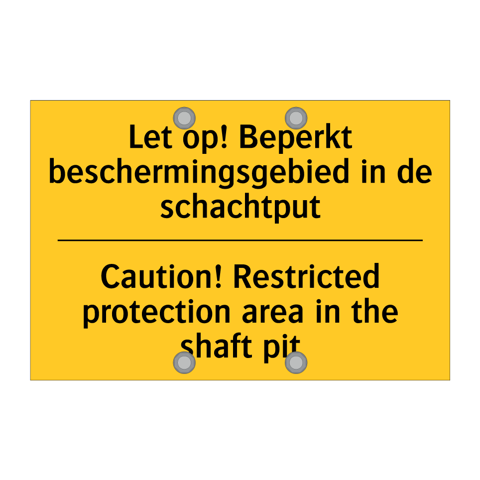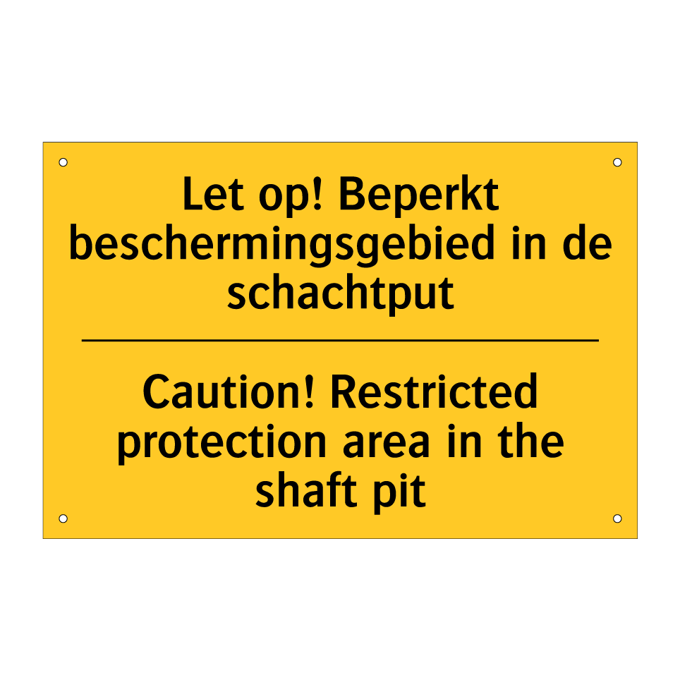 Waarschuwingsbord met de tekst Let op! Beperkt beschermingsgebied in de schachtput / Caution! Restricted protection area in the shaft pit