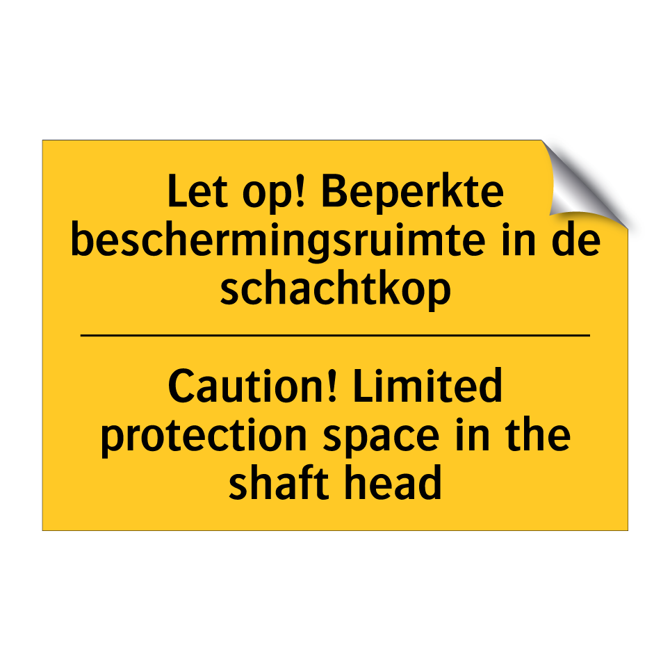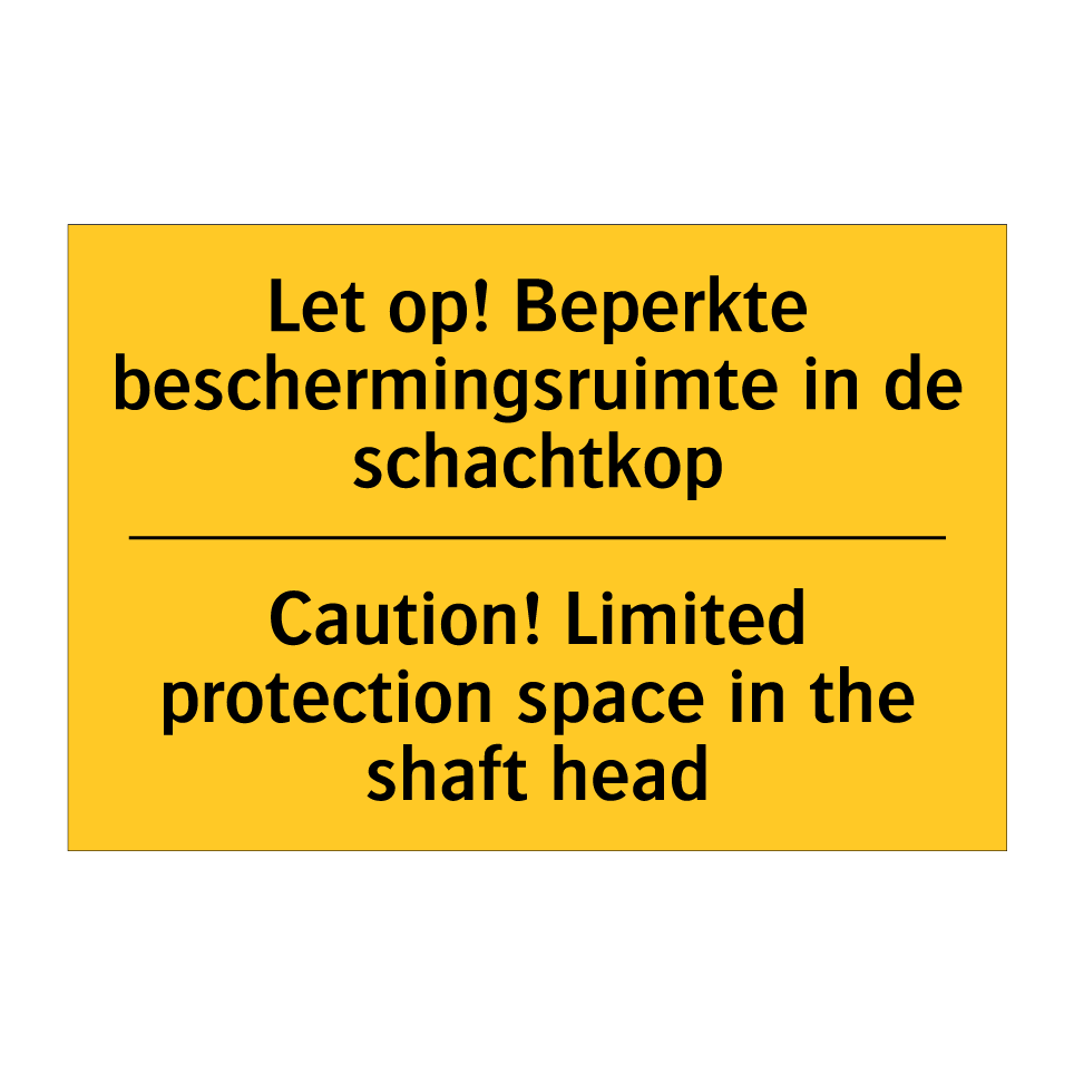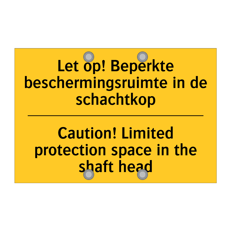 Waarschuwingsbord met de tekst Let op! Beperkte beschermingsruimte in de schachtkop / Caution! Limited protection space in the shaft head