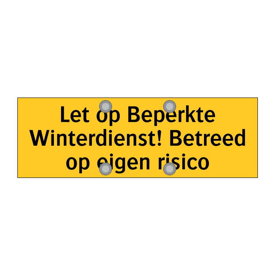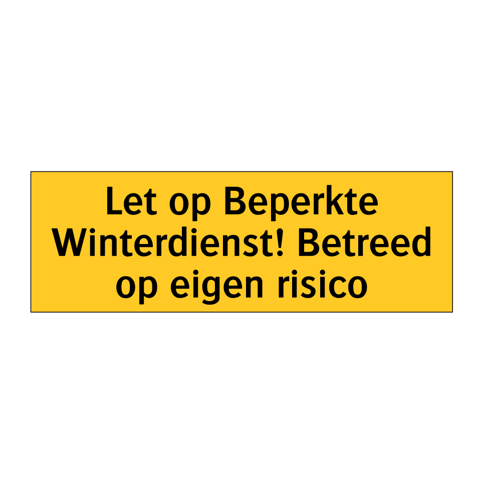 Waarschuwingsbord met de tekst Let op Beperkte Winterdienst! Betreed op eigen risico