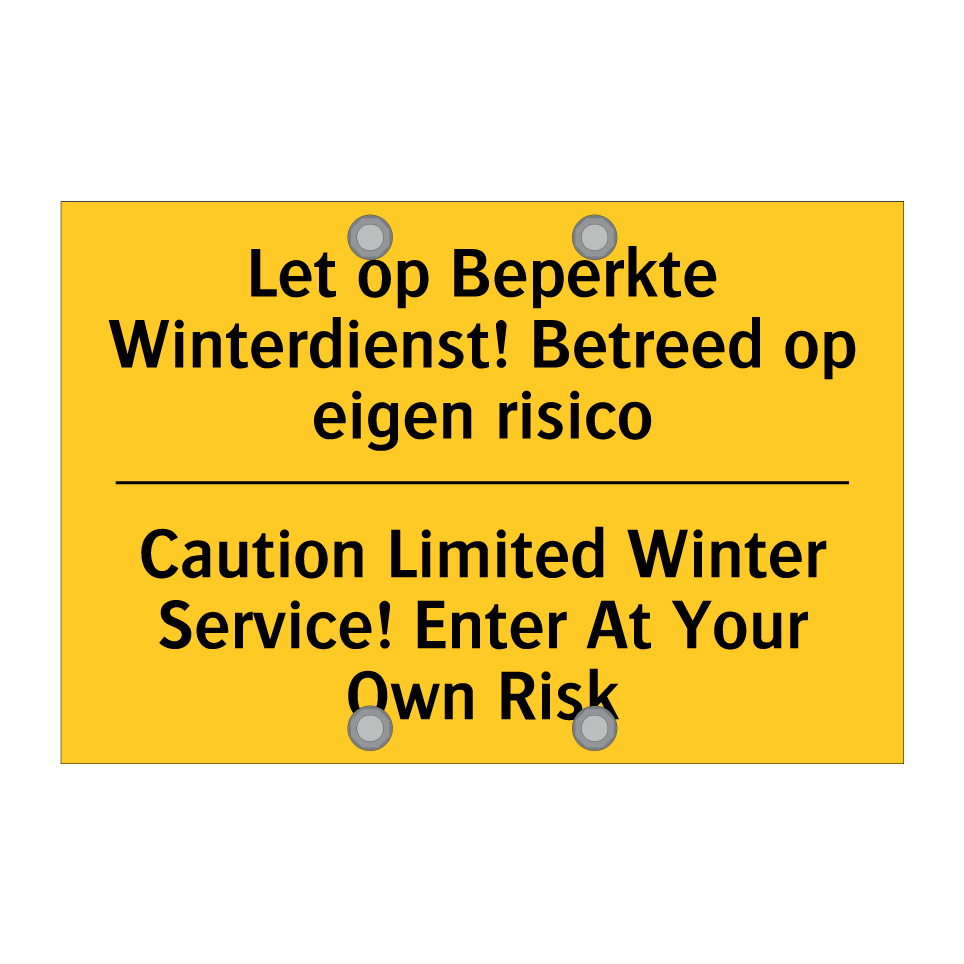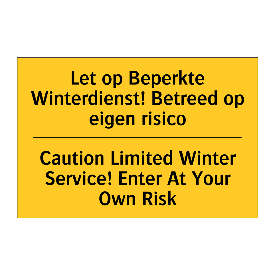 Waarschuwingsbord met de tekst Let op Beperkte Winterdienst! Betreed op eigen risico / Caution Limited Winter Service! Enter At Your Own Risk