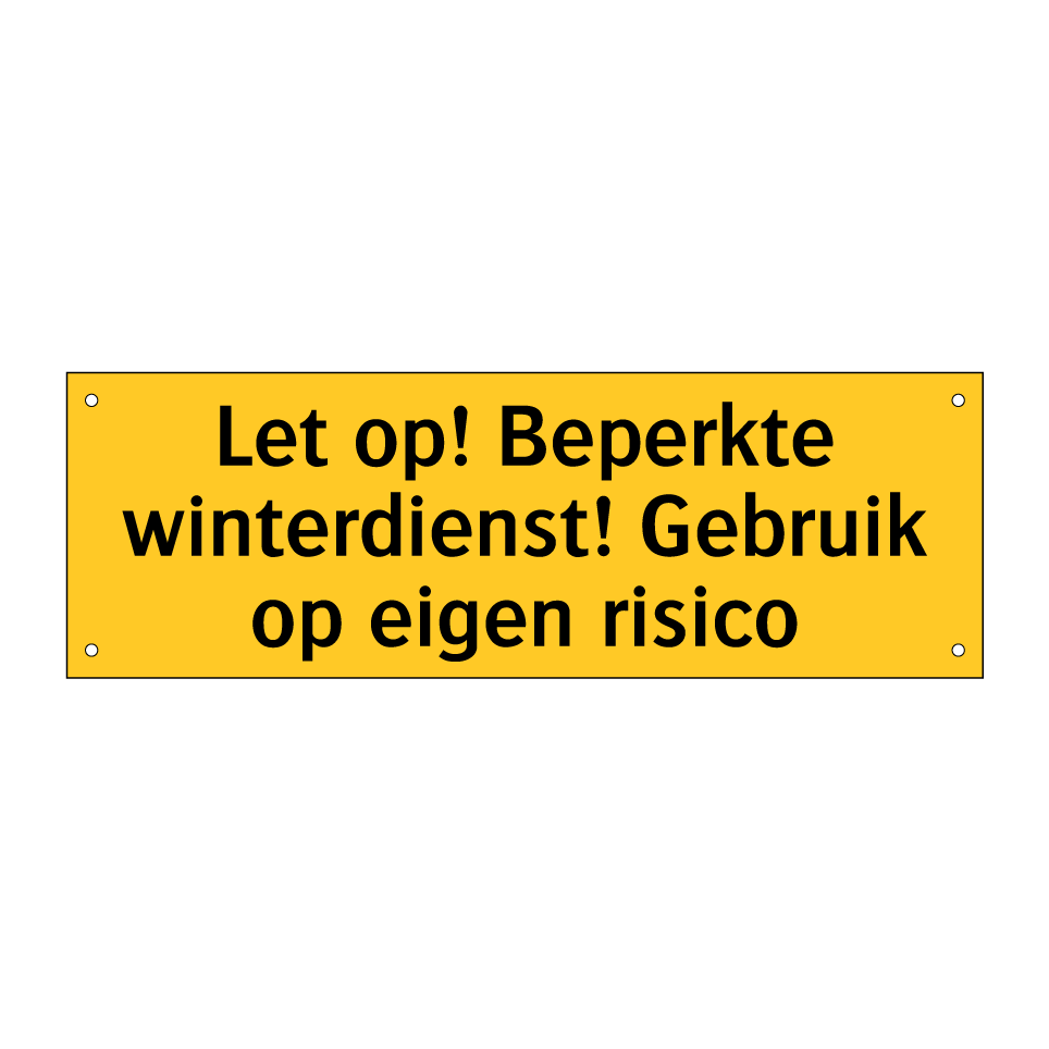 Waarschuwingsbord met de tekst Let op! Beperkte winterdienst! Gebruik op eigen risico